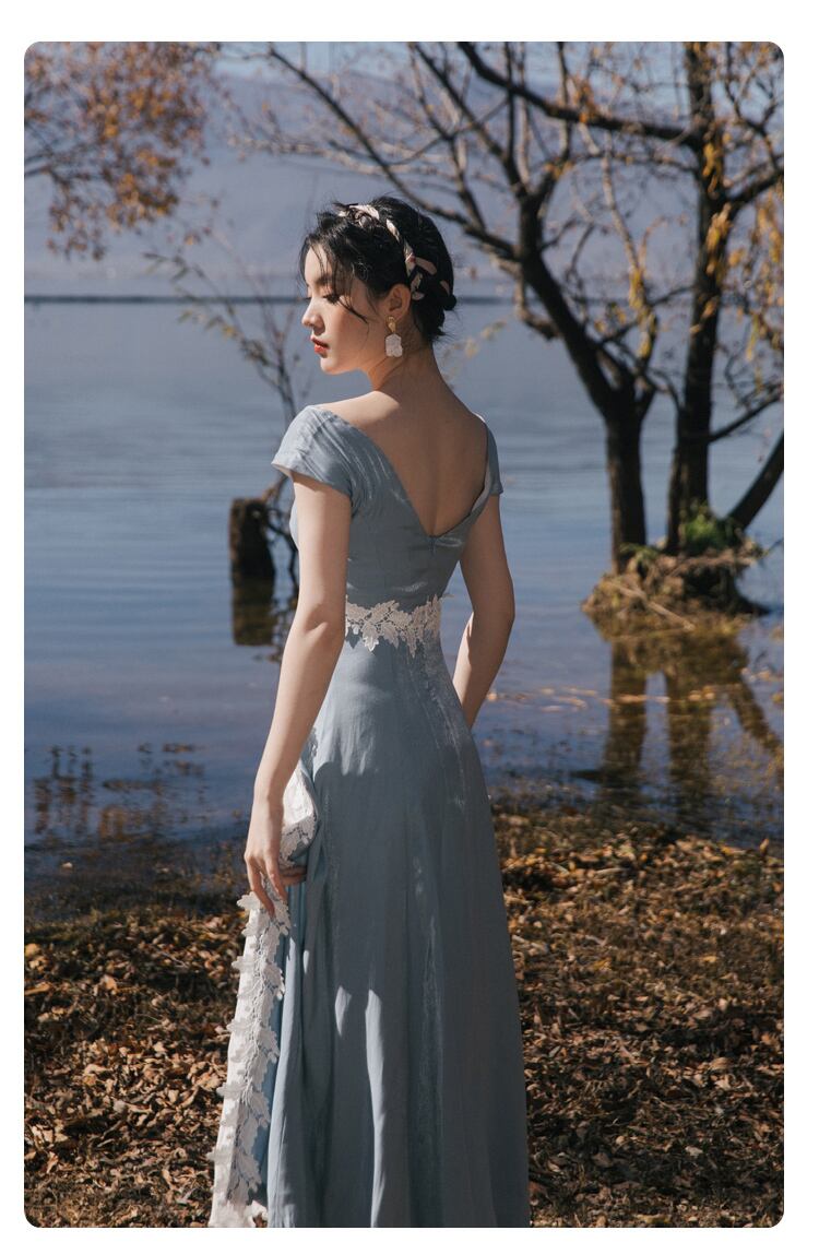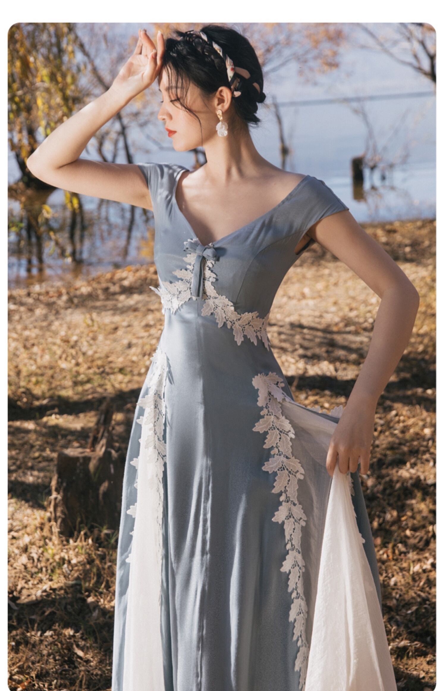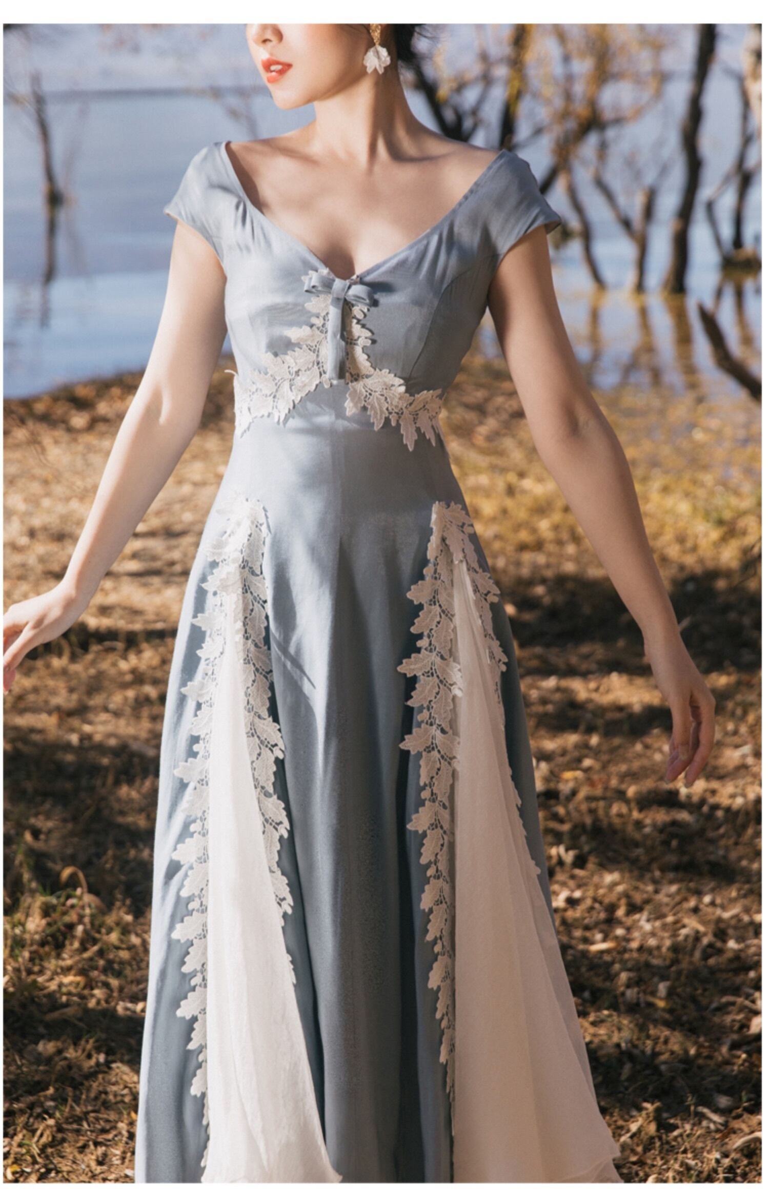 送料無料୨♥୧ サマーレディースAラインミディドレス Vネックレースメッシュパッチワーク 夏物 AOS96664999870