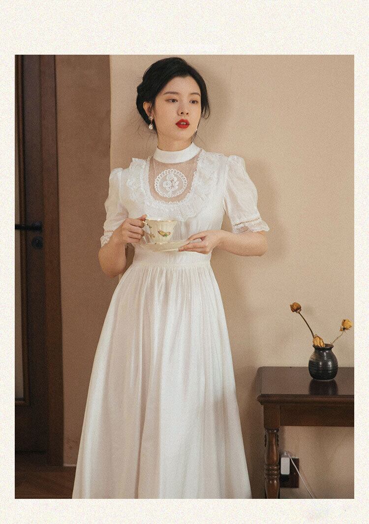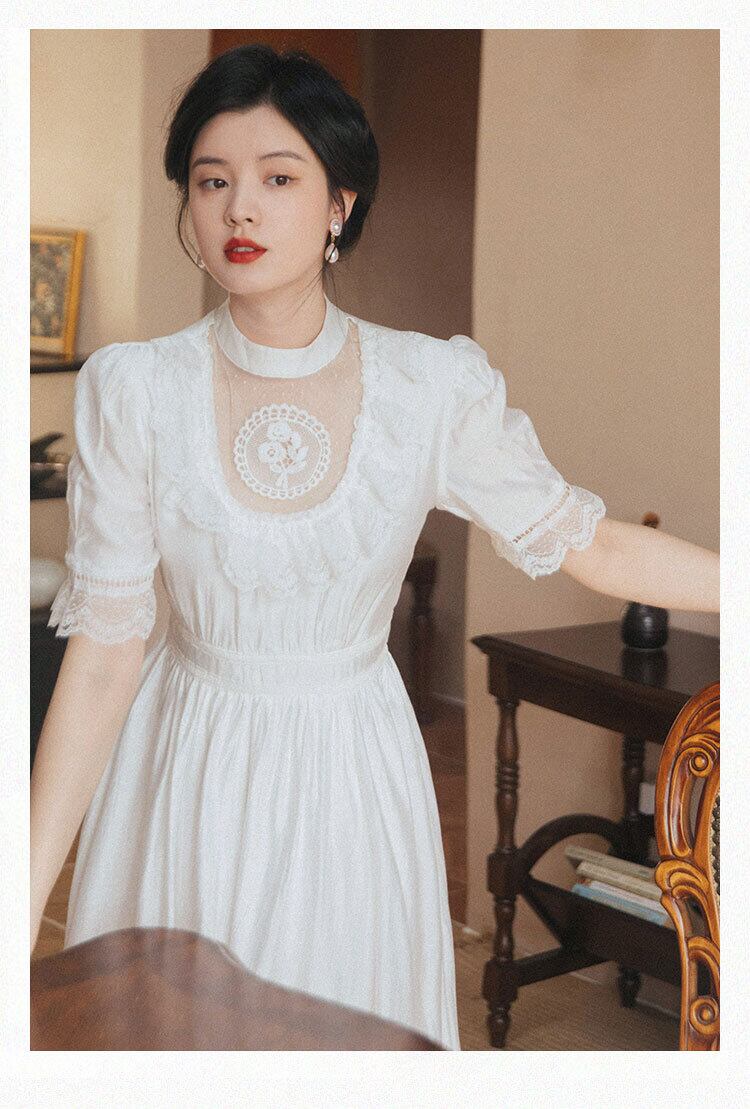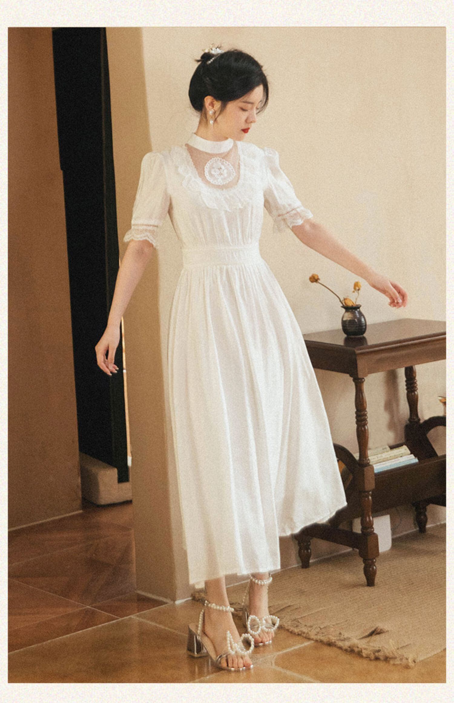 送料無料୨♥୧ サマーレディースホワイトミディAラインドレス メッシュパッチワークレーススリーブ 夏物 AOS29498740070