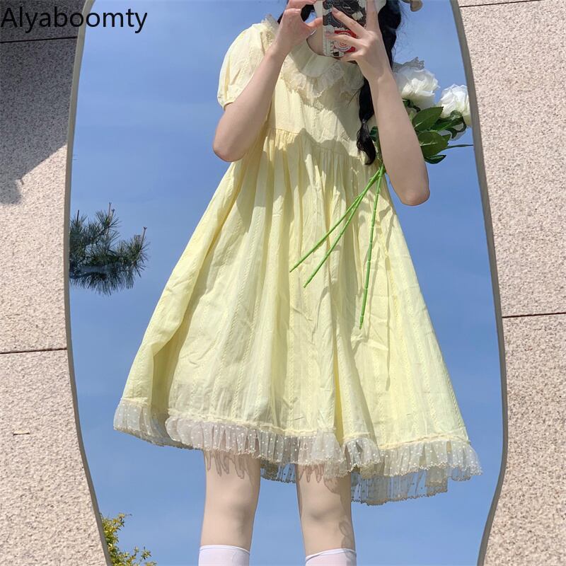 送料無料୨♥୧ サマーレディースドレス カラーイエロースタイルスリーブレースフリルドレス ワンピース ラッフル 大人ガーリー スウィート キュート カジュアル 夏物 AOS8955264757