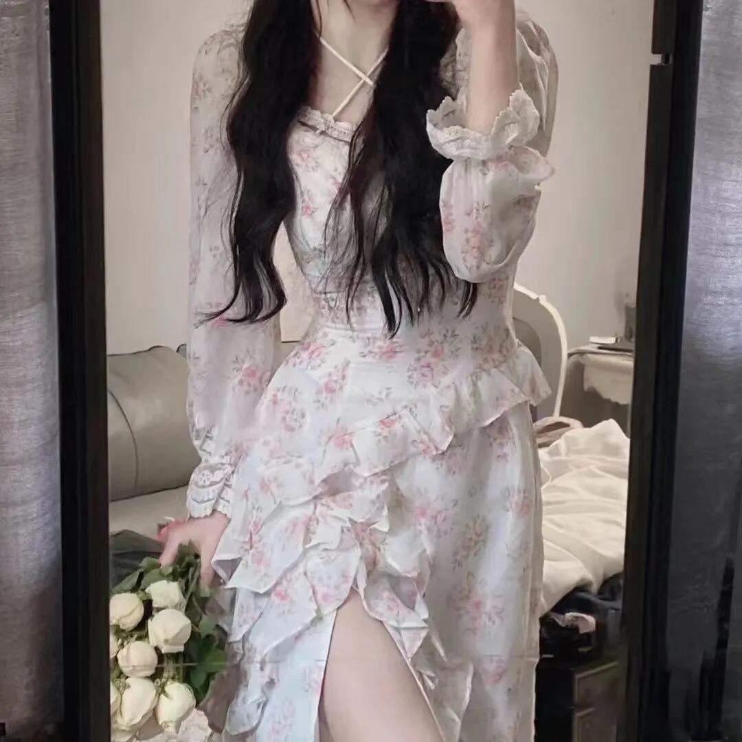 送料無料୨♥୧ スプリングオータムレディースフローラルシフォンドレス カラーレースフリルロング レッド ラッフル 春物 秋物 花柄 スクウェア AOS36857317165