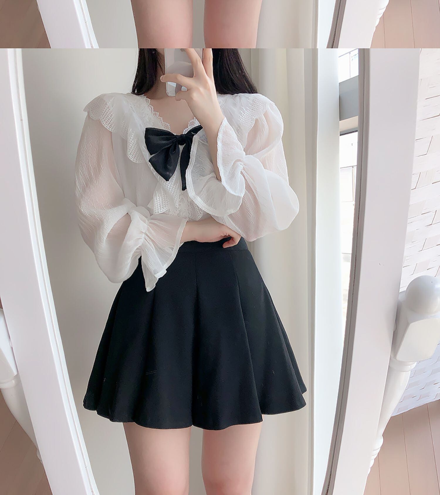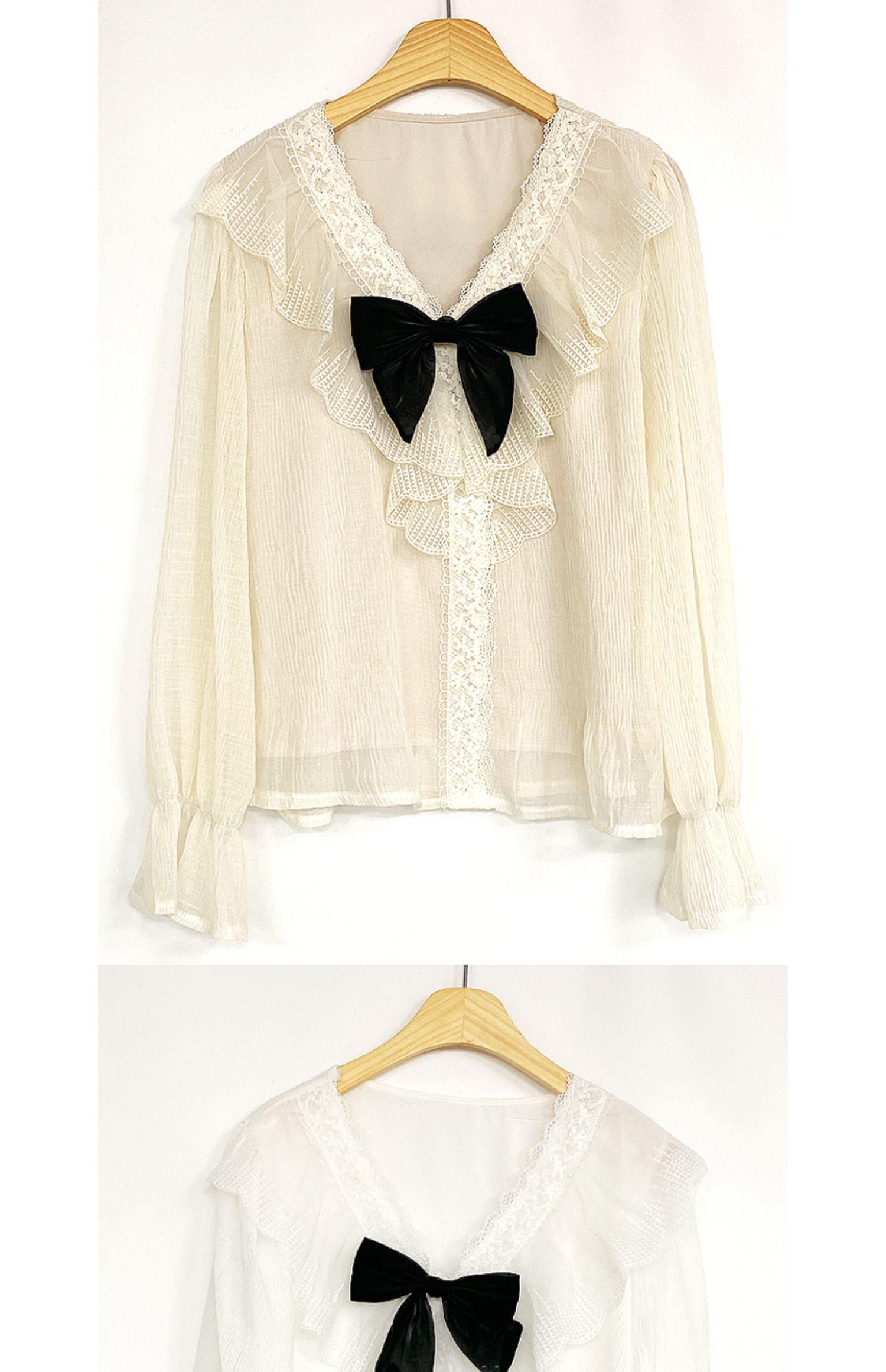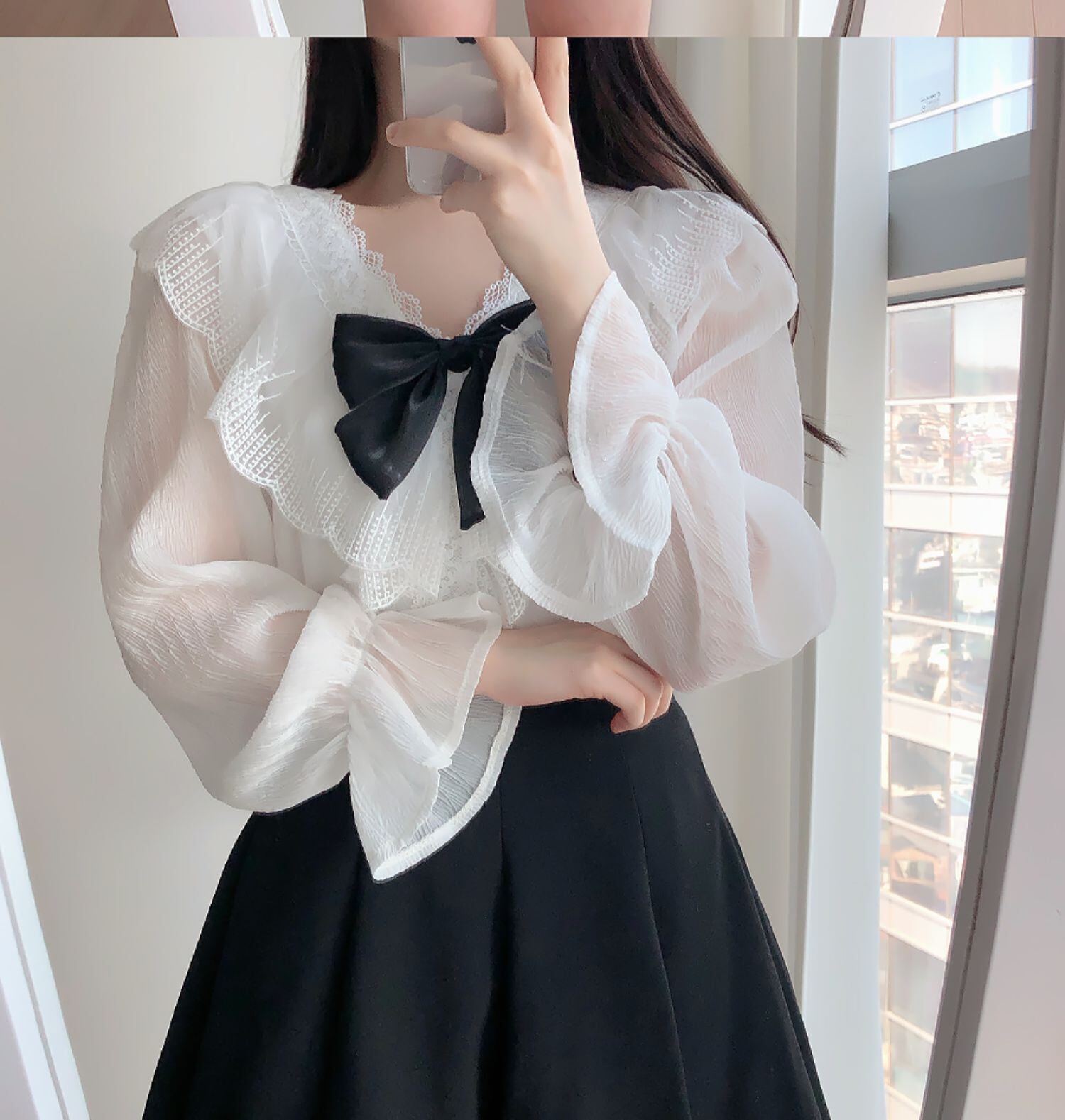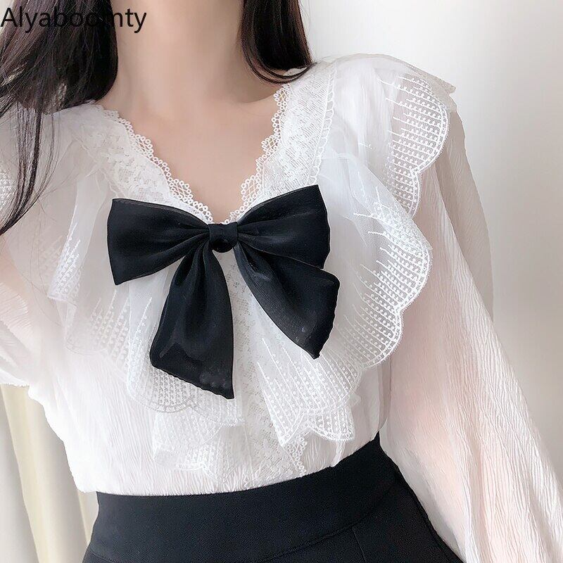 送料無料୨♥୧ スタイルスプリングサマーレディースソリッド ブラウス Vネックリボンホワイトルーズ長袖スリーブフリルシャツ ロング ラッフル 春物 夏物 ソリッドカラー AOS67980779393