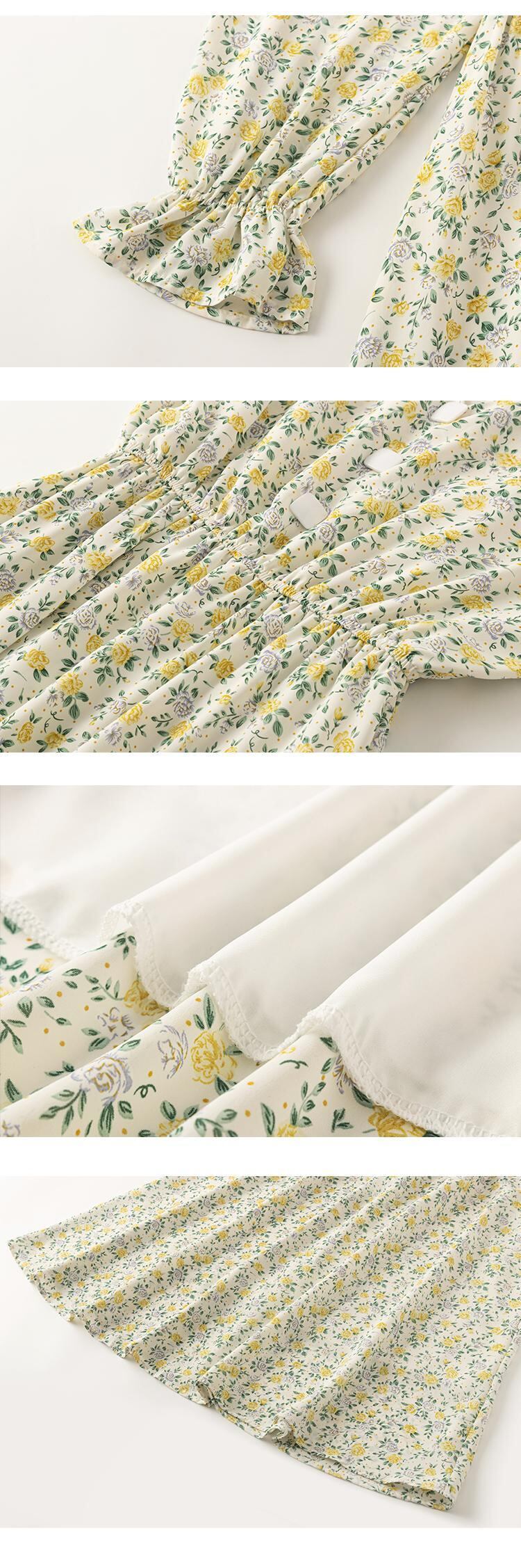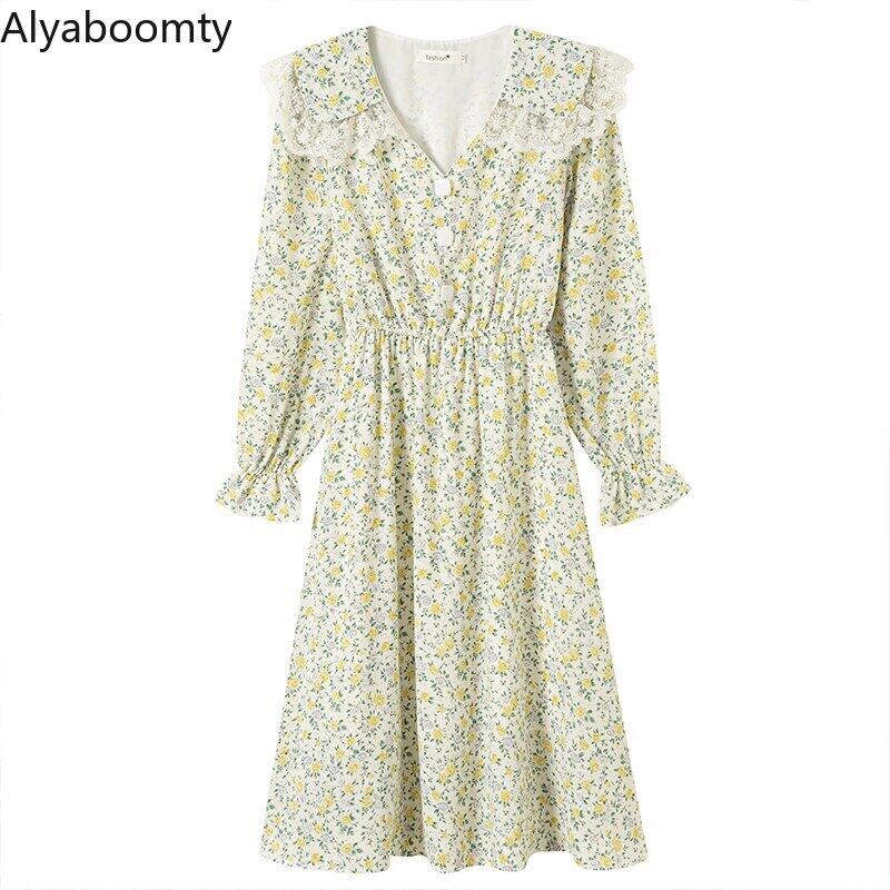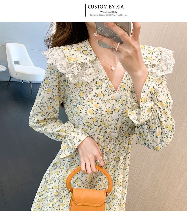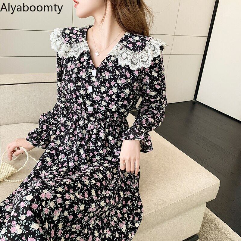 送料無料୨♥୧ スプリングオータムレディースドレス カラーレースフローラルプリント長袖スリーブ ロング 大人ガーリー スウィート キュート カジュアル 春物 秋物 花柄 AOS41860142344