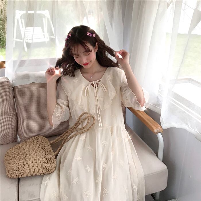 送料無料୨♥୧ サマーレディーススタイルドレス カラールーズButterflyデザイン 刺繍ミディフリル ラッフル 大人ガーリー スウィート キュート カジュアル 夏物 AOS44109440974