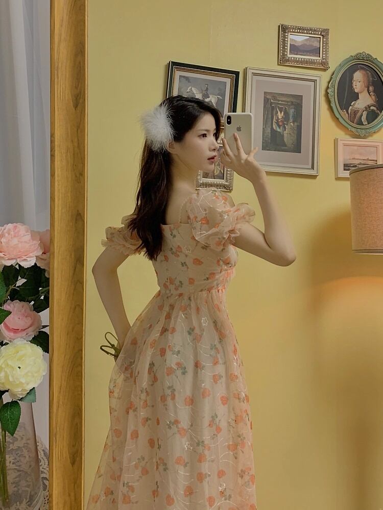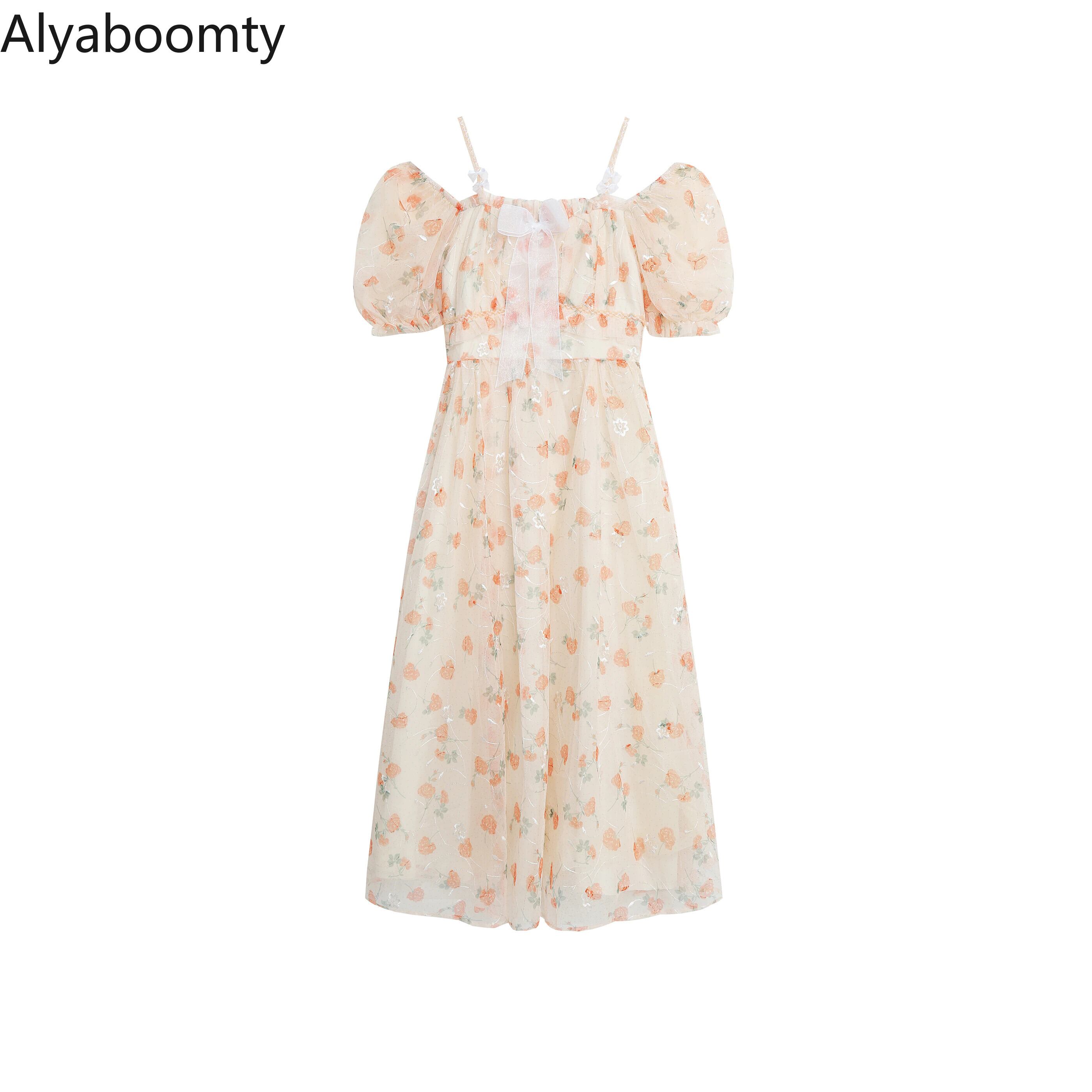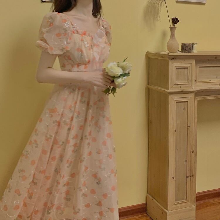 送料無料୨♥୧ サマーレディースフローラルミディドレス リボンメッシュスリーブ刺繍ロング 大人ガーリー スウィート キュート カジュアル 夏物 花柄 AOS37917329164