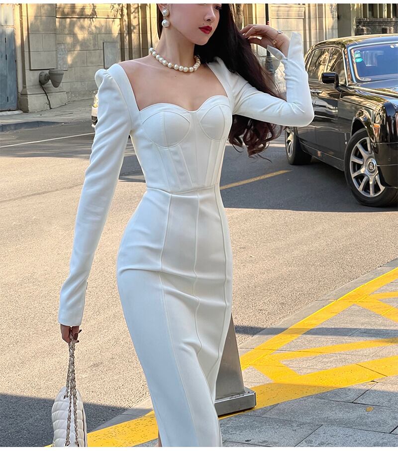送料無料୨♥୧ スプリングオータムレディースAラインミディドレス カラーレースブラックホワイト長袖スリーブ ロング 春物 秋物 レースアップ スクウェア 会社 学校 通勤や通学にも AOS41024977799