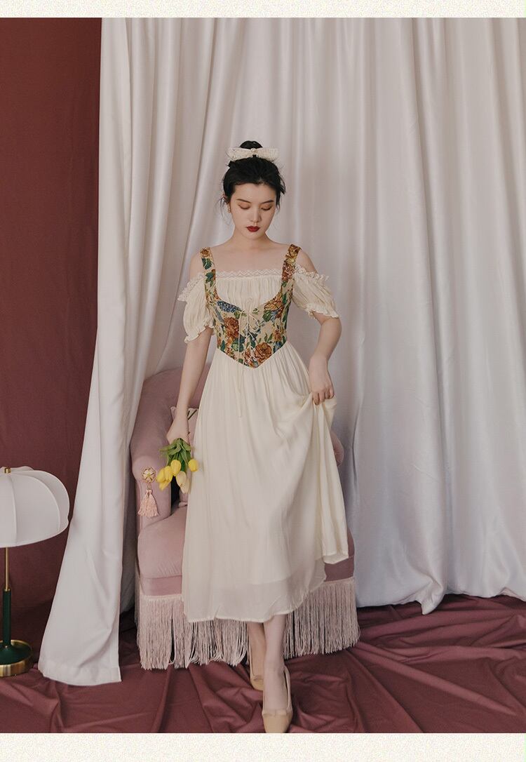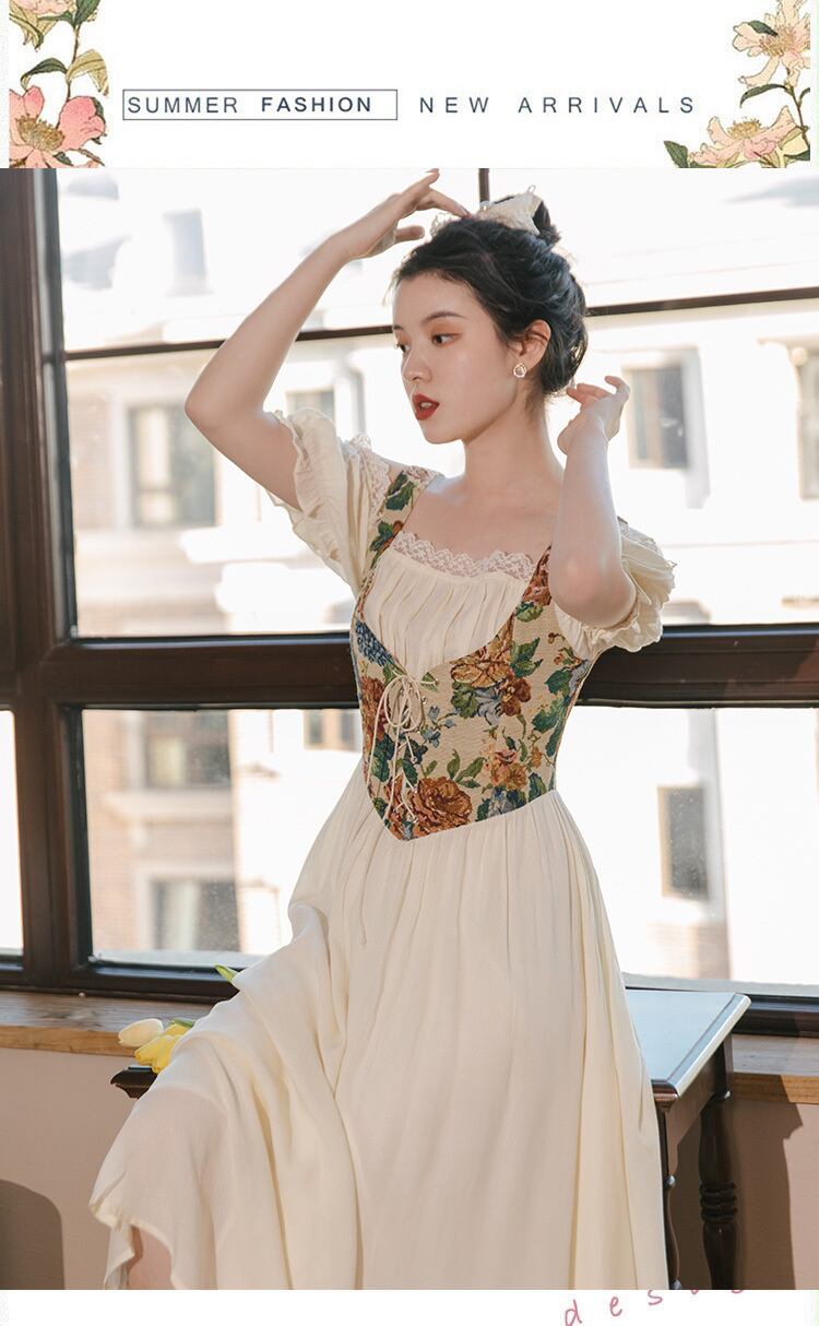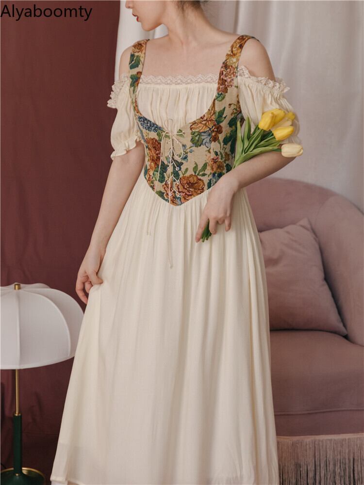 送料無料୨♥୧ スタイルサマーレディースパッチワークAラインドレス ジャカードヴィンテージバンドオフショルダースタンダード レトロ 夏物 ビンテージ AOS20347356005