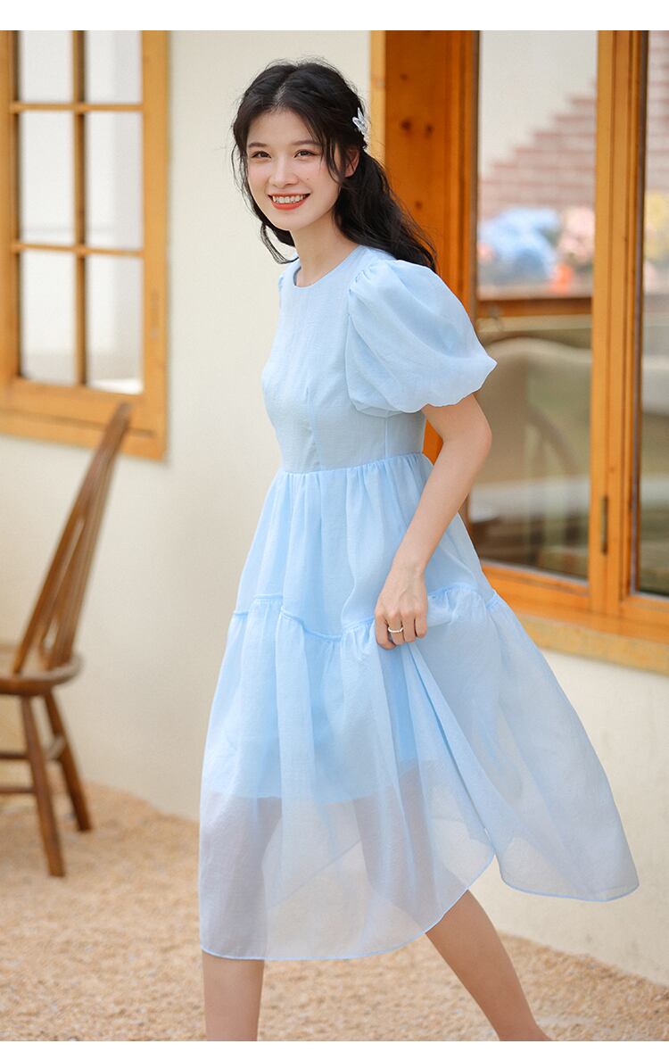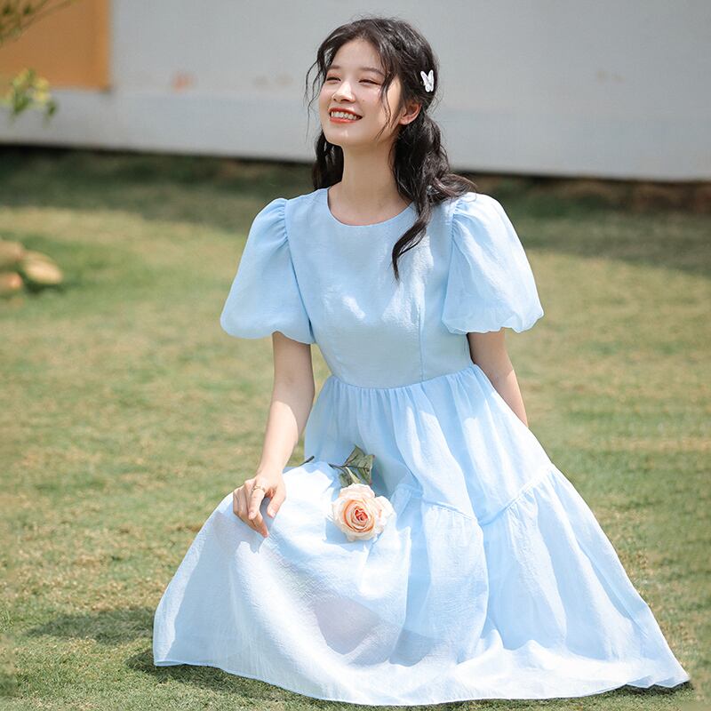 送料無料୨♥୧ サマーレディースミディドレス カラーブルースリーブ 大人ガーリー スウィート キュート カジュアル 夏物 スクウェア AOS99912192605