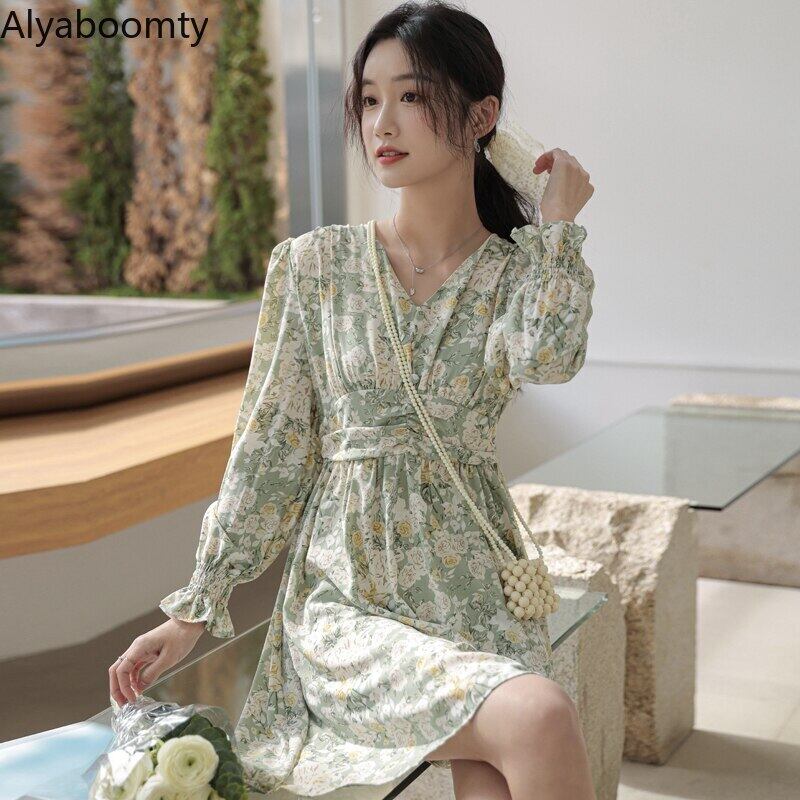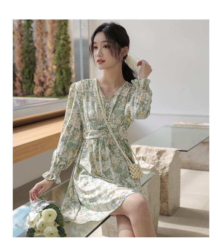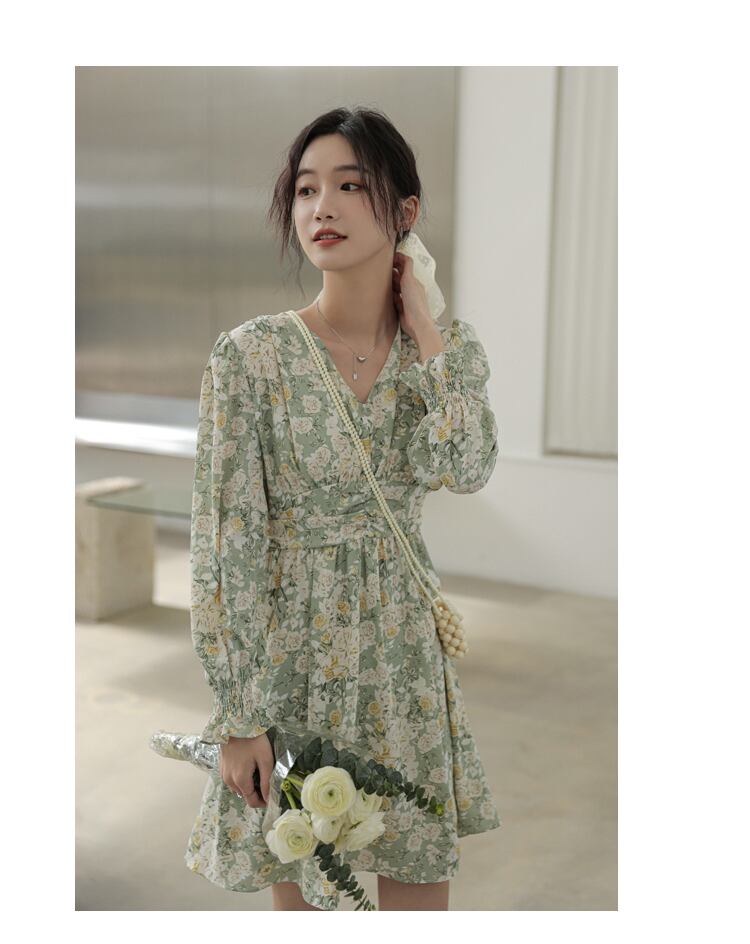 送料無料୨♥୧ スプリングオータムレディースミニドレス Vネックグリーンフローラルプリントウェスト長袖スリーブショート ロング 大人ガーリー スウィート キュート カジュアル 春物 秋物 花柄 AOS17172328490