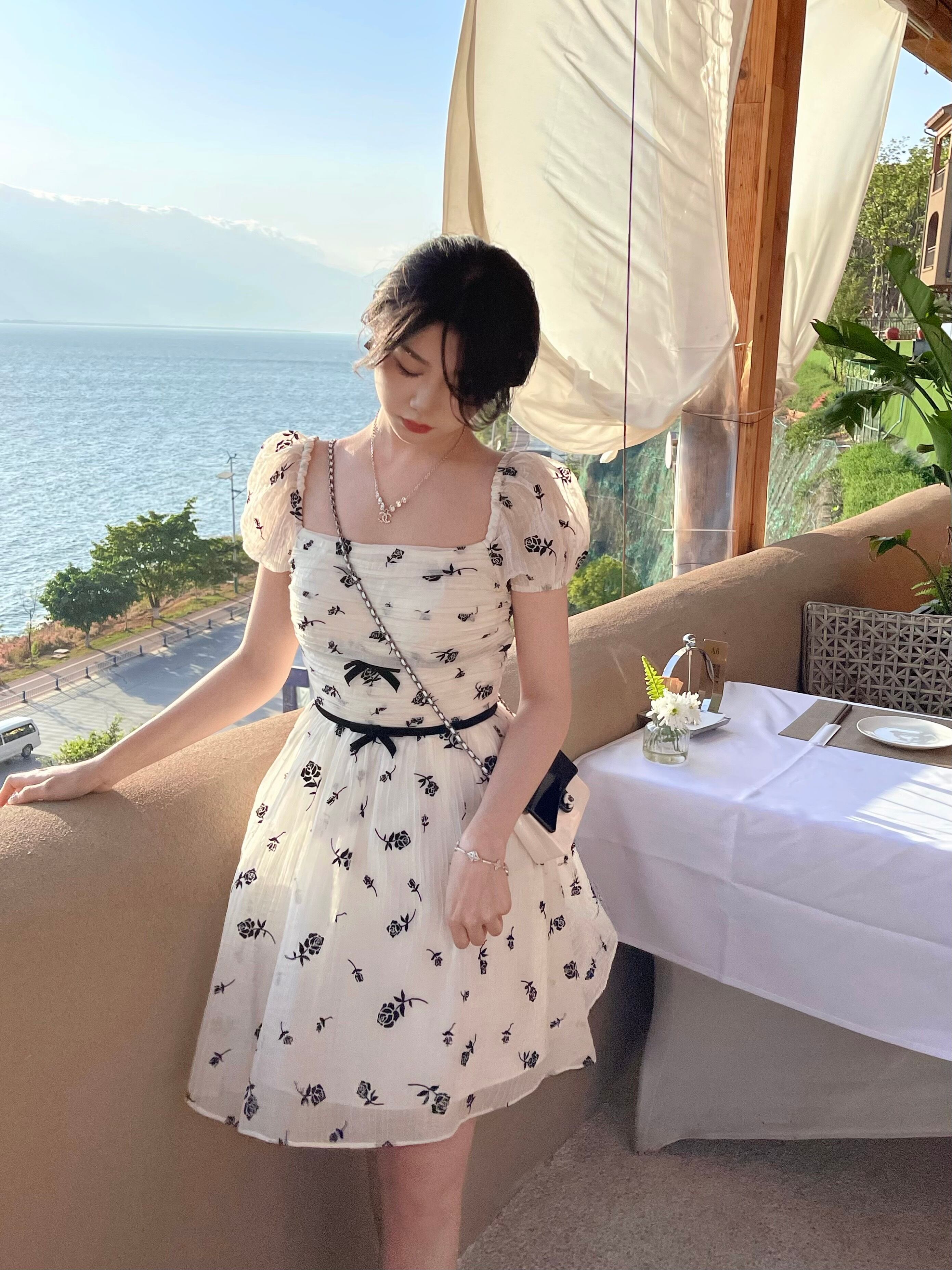 送料無料୨♥୧ サマーレディースミニドレス カラーブラックプリントリボンスリーブヴィンテージ 大人ガーリー スウィート キュート カジュアル 夏物 スクウェア ビンテージ AOS88616973493