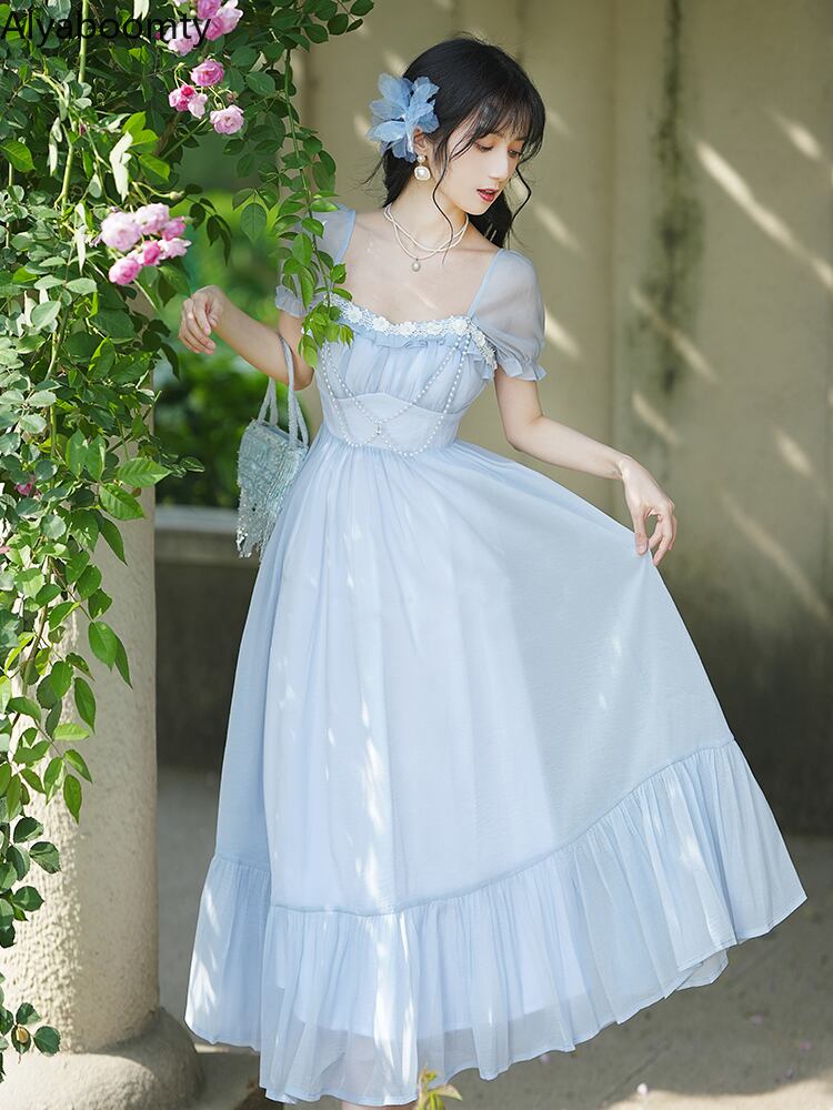 送料無料୨♥୧ サマーレディースロングドレス カラーブルーフローラルフリルバンド ラッフル 大人ガーリー スウィート キュート カジュアル 夏物 花柄 チェーン スクウェア AOS95583172930