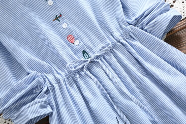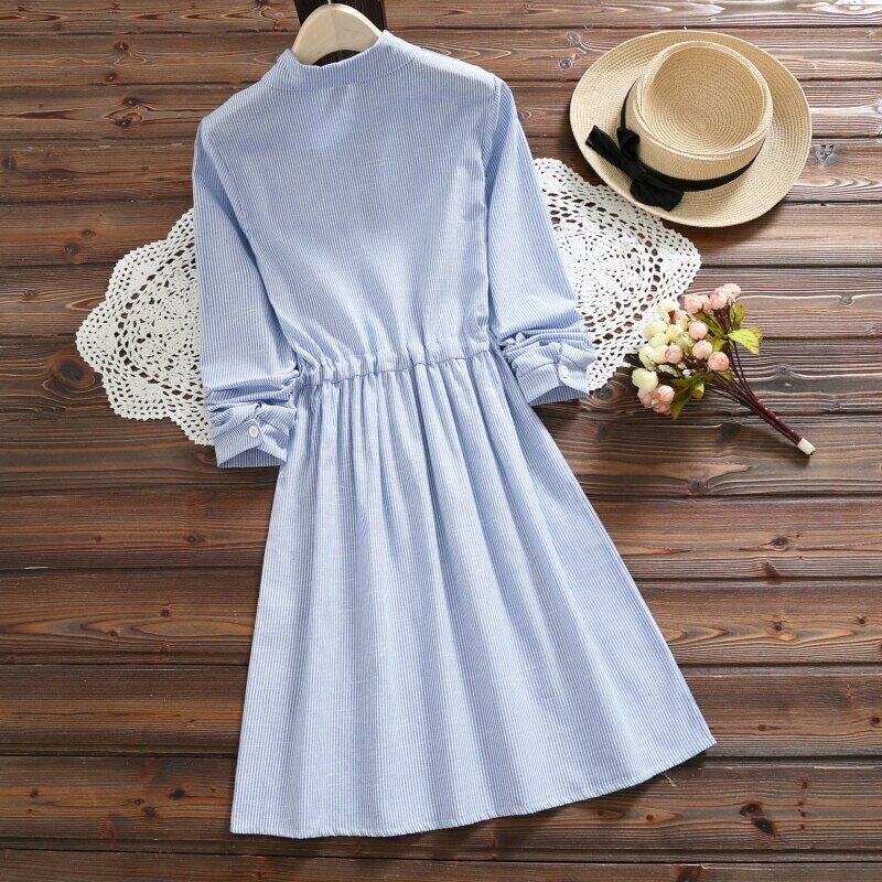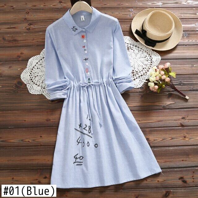 送料無料୨♥୧ オータムスプリングレディースドレス カラー刺繍ブルーストライプ コットン 大人ガーリー スウィート キュート カジュアル 春物 秋物 AOS82354015440