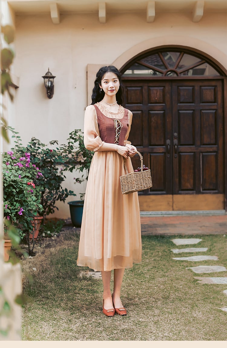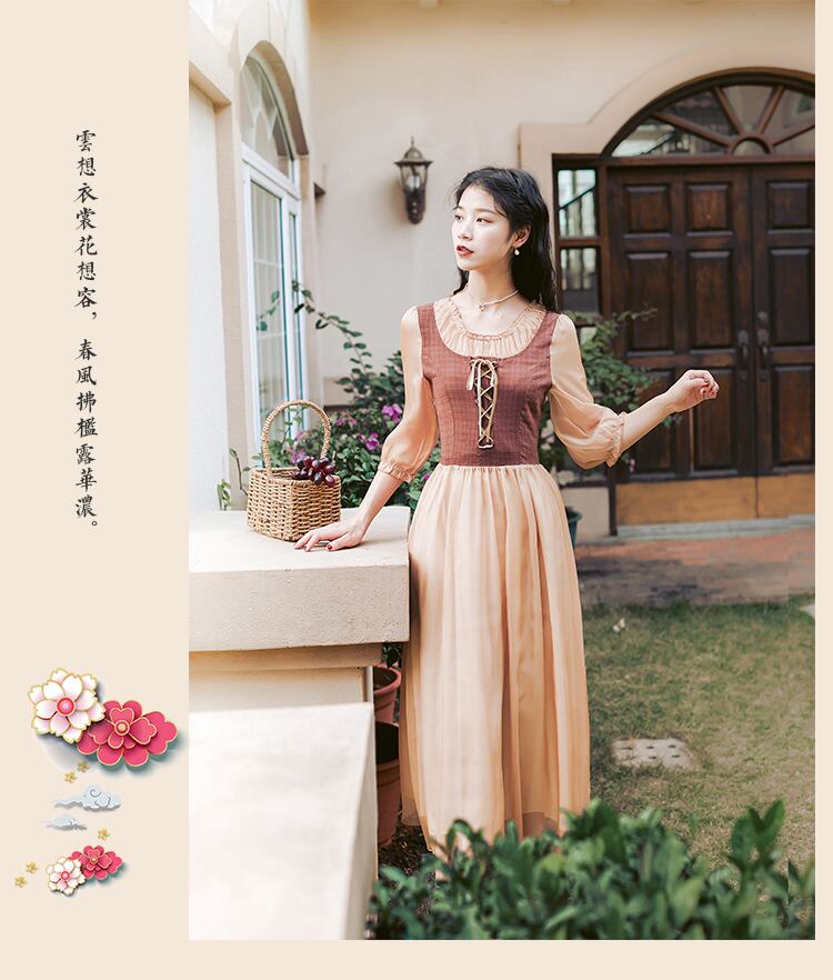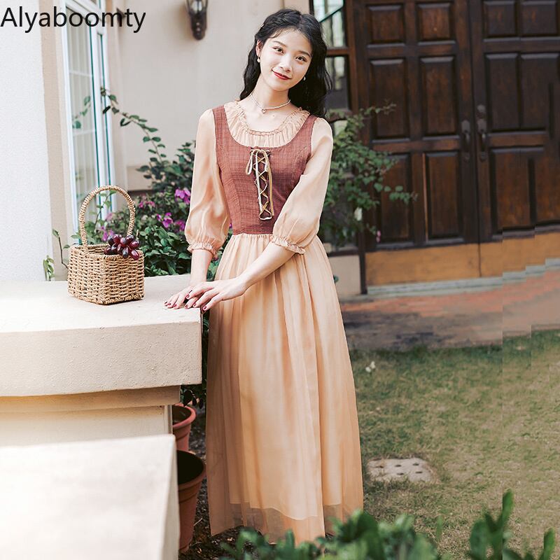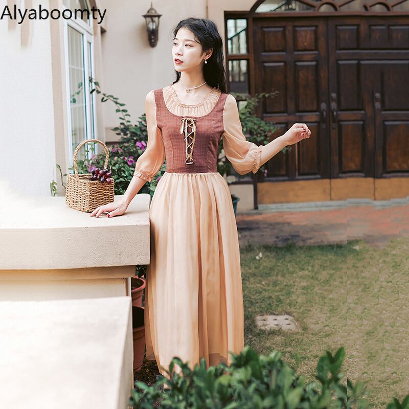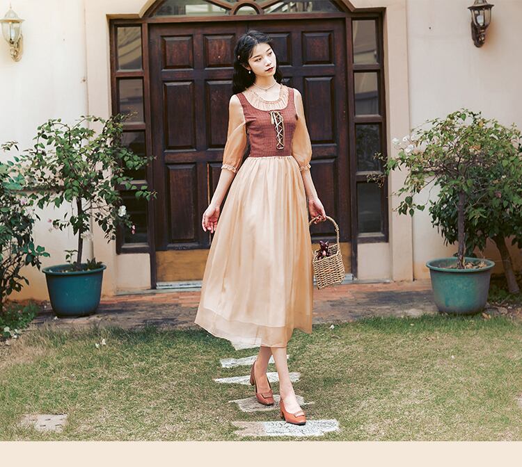 送料無料୨♥୧ サマーオータムレディースミディスタンダードドレス バンドパッチワークメッシュ七部袖スリーブヴィンテージ レトロ 大人ガーリー スウィート キュート カジュアル 夏物 秋物 ビンテージ AOS76809730435