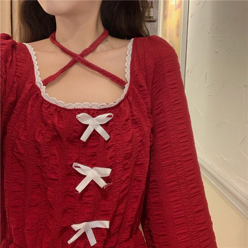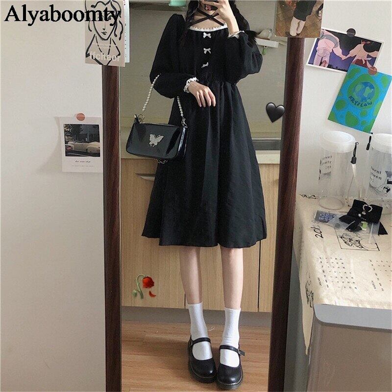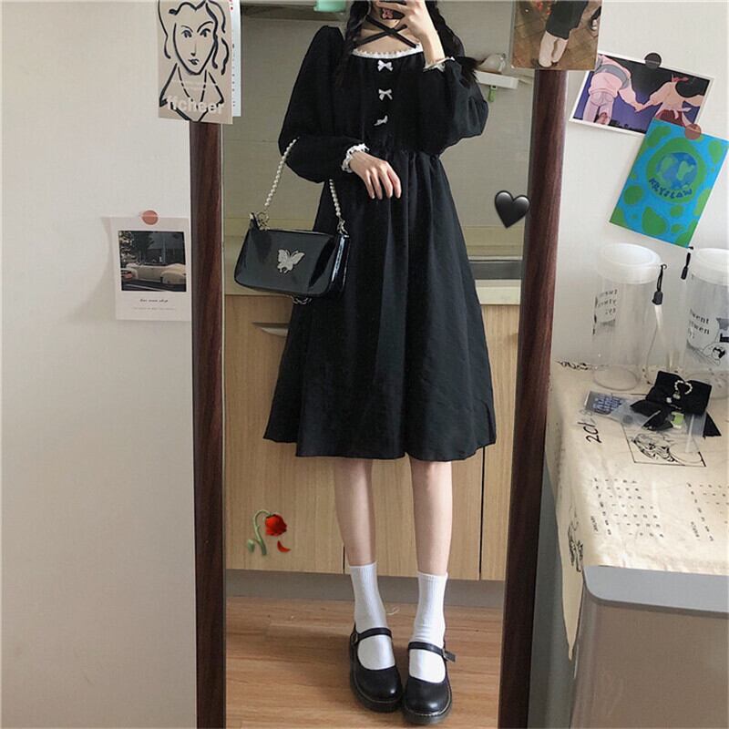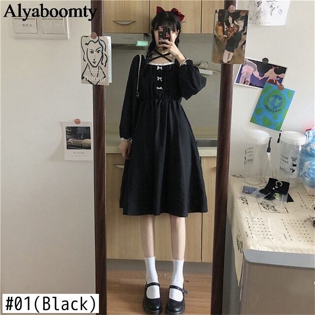 送料無料୨♥୧ レディースストリートウェアオータムドレス クロスカラーブラックリボンドレス ワンピース エラスティック 伸縮 大人ガーリー スウィート キュート カジュアル かわいい 秋物 AOS18715943551