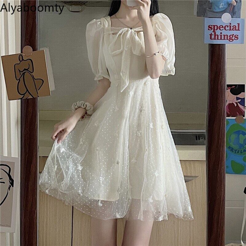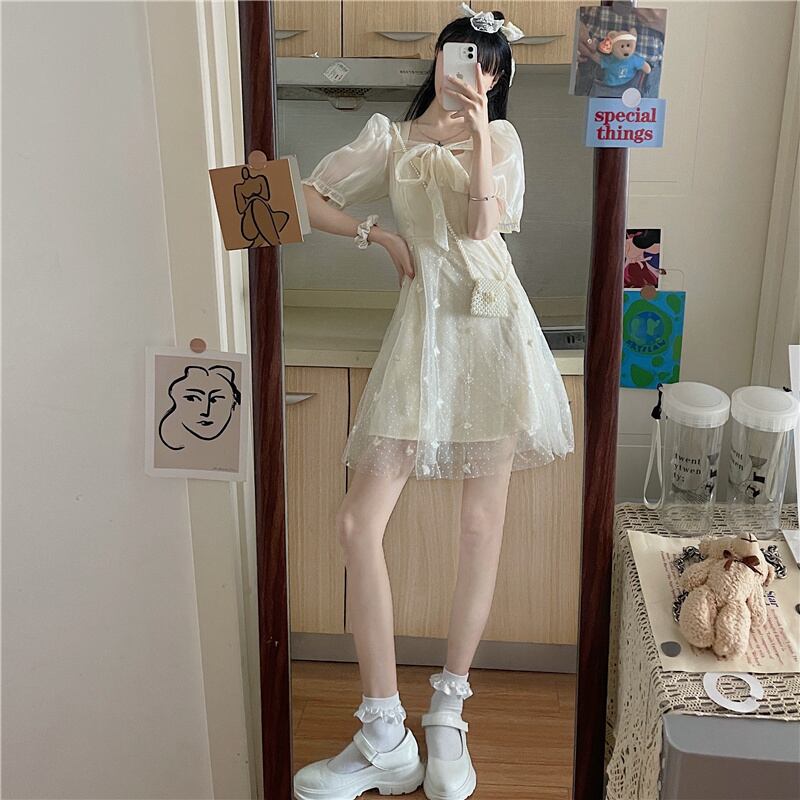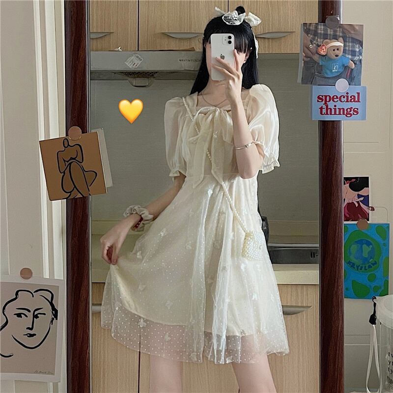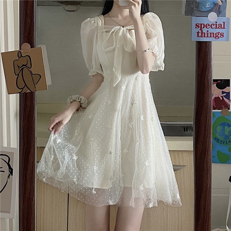 送料無料୨♥୧ サマーレディースドレス カラーリボンButterflyデザイン 刺繍メッシュスリーブドレス ワンピース 大人ガーリー スウィート キュート カジュアル 夏物 スクウェア AOS23693941817