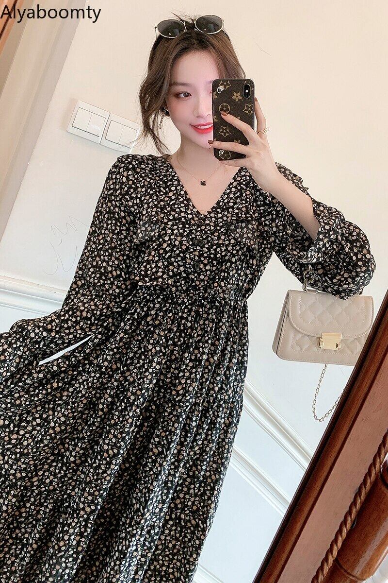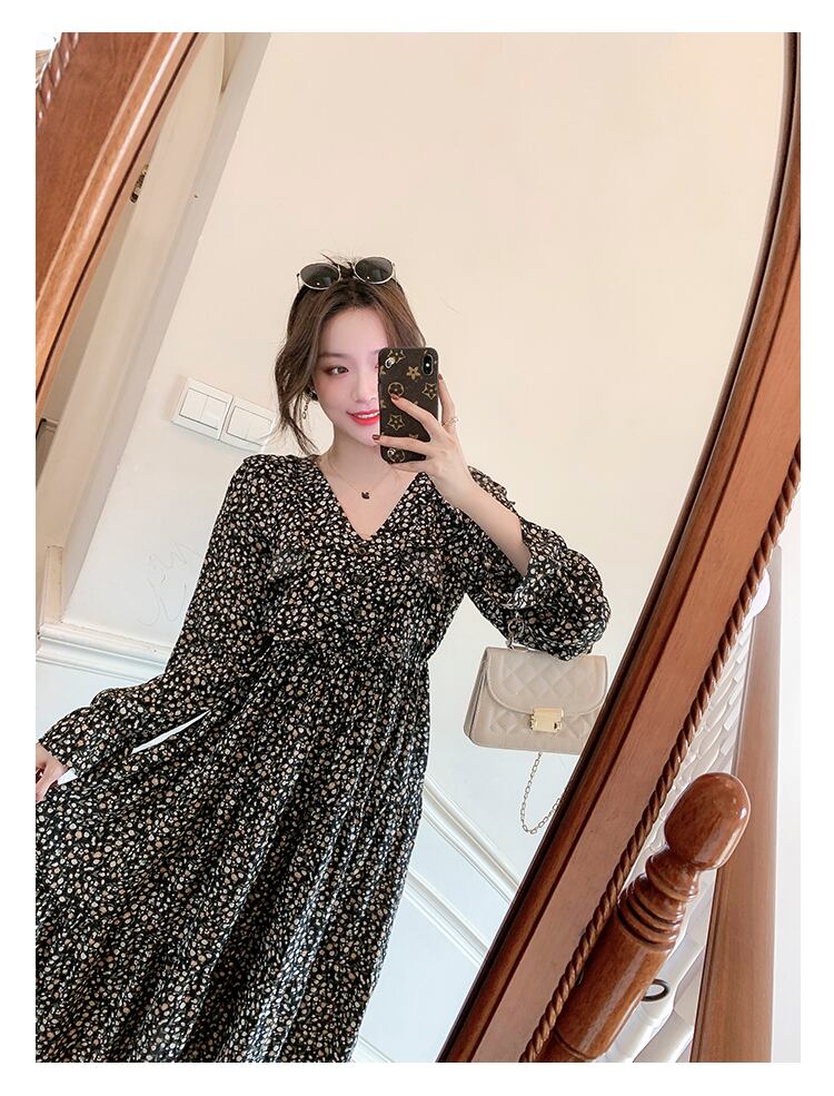 送料無料୨♥୧ スプリングオータムレディースドレス Vネックブラックプリントシフォン長袖スリーブフリルミディ ロング ラッフル 春物 秋物 AOS46710376375