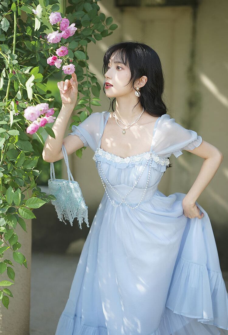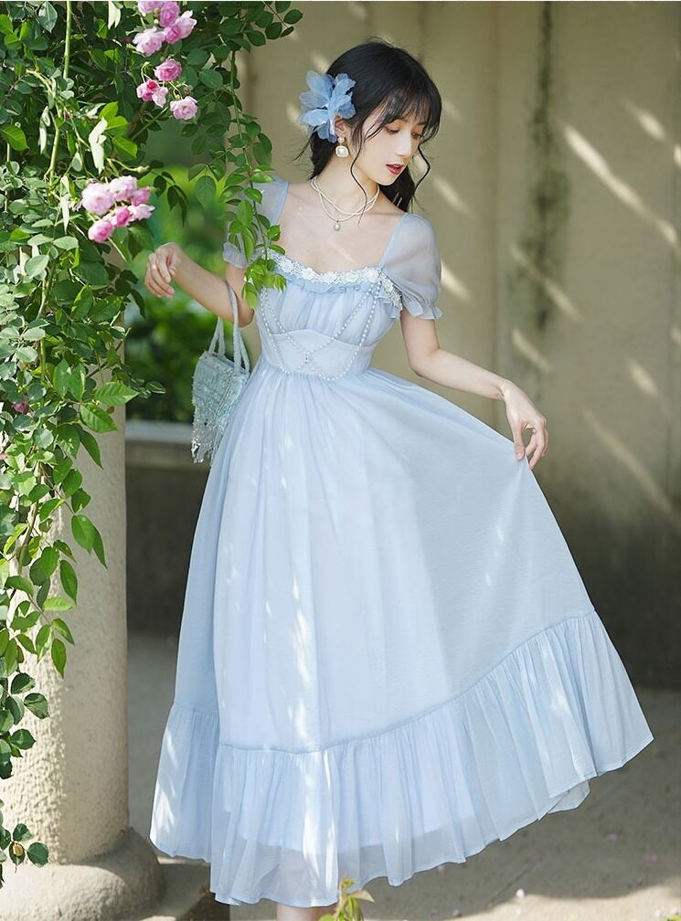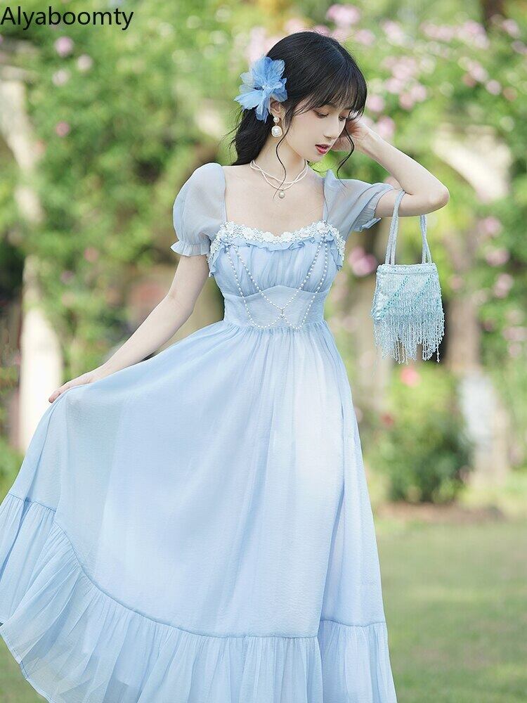 送料無料୨♥୧ サマーレディースロングドレス カラーブルーフローラルフリルバンド ラッフル 大人ガーリー スウィート キュート カジュアル 夏物 花柄 チェーン スクウェア AOS25565873898