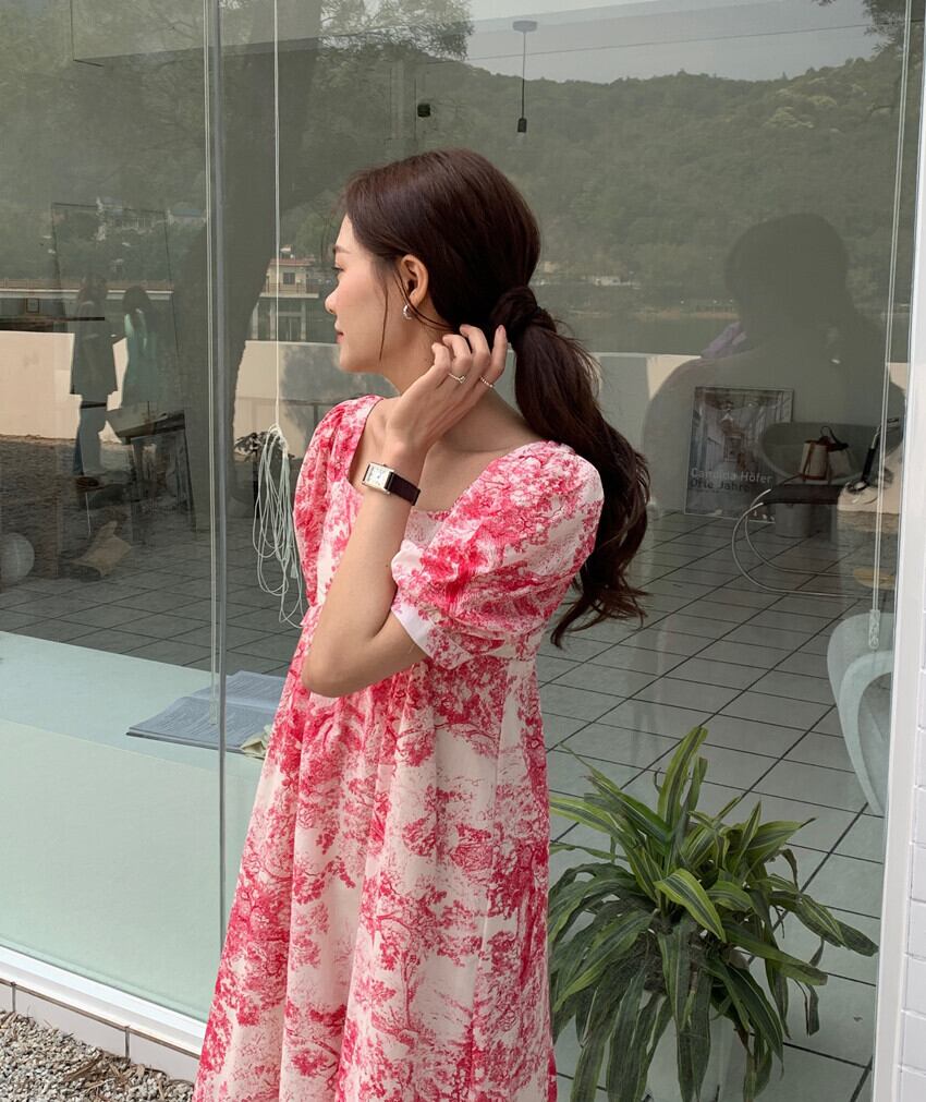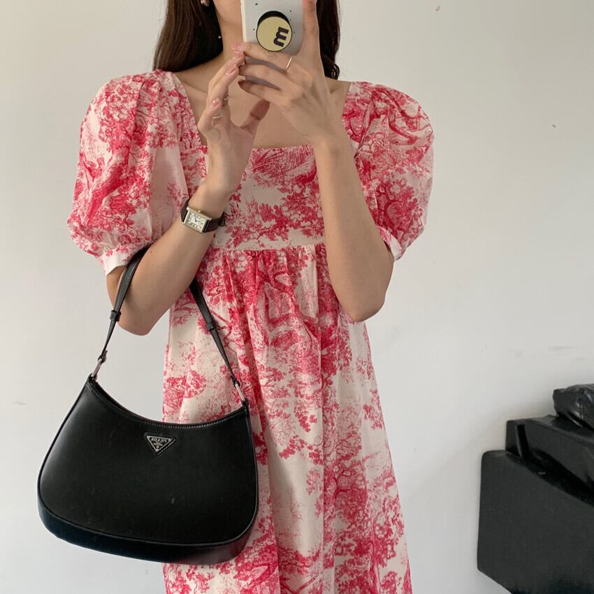 送料無料୨♥୧ サマーレディースドレス カラープリントルーズスリーブヴィンテージ 夏物 スクウェア ビンテージ AOS14255463145