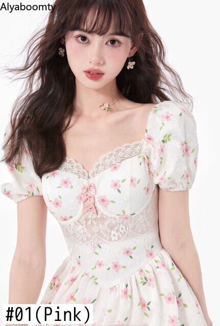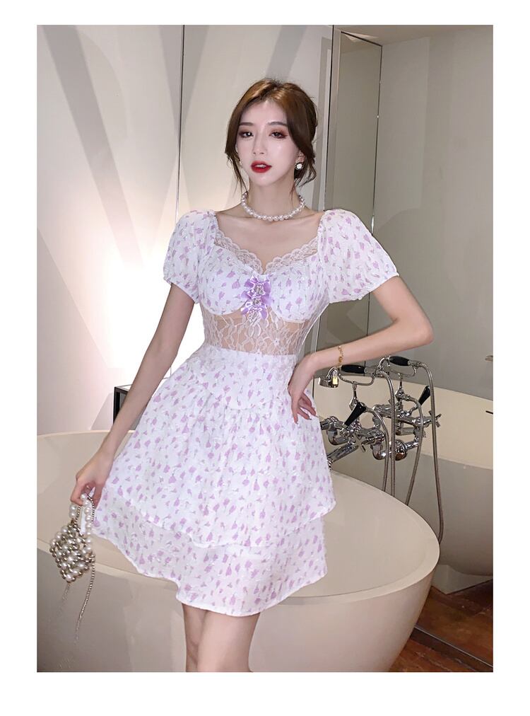 送料無料୨♥୧ サマーレディースミニドレス カラーフローラルリボンスリーブレースフリル ピンク レッド ラッフル 大人ガーリー スウィート キュート カジュアル 夏物 花柄 パープル スクウェア AOS75327680243