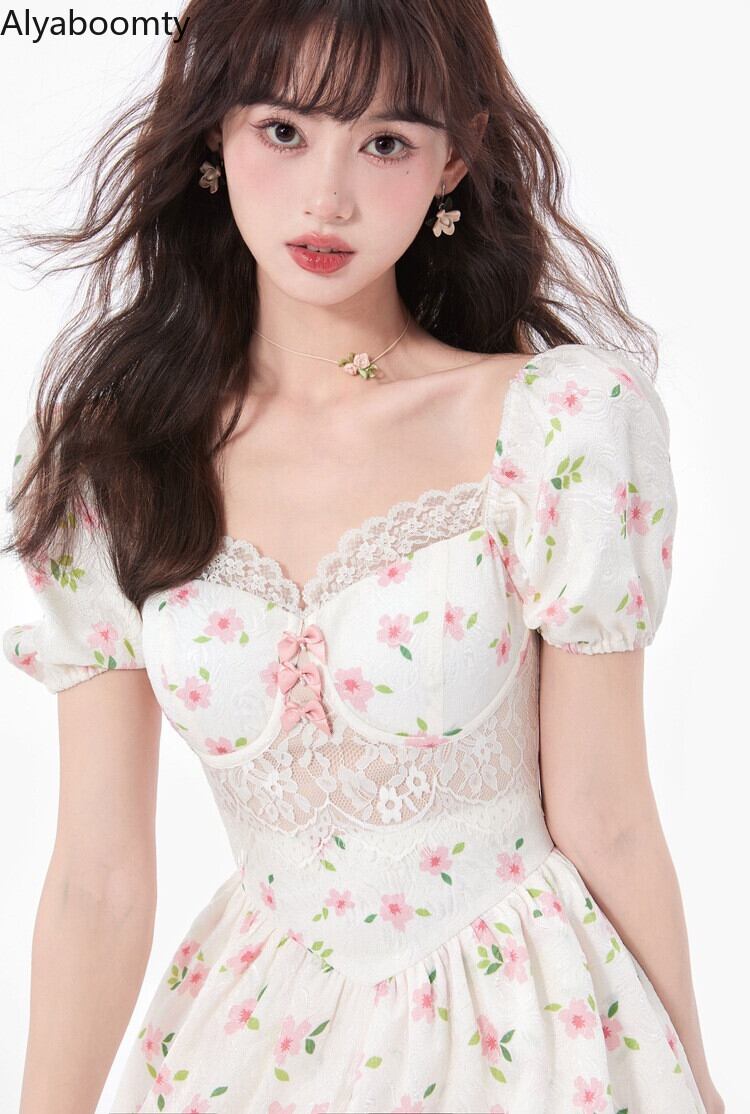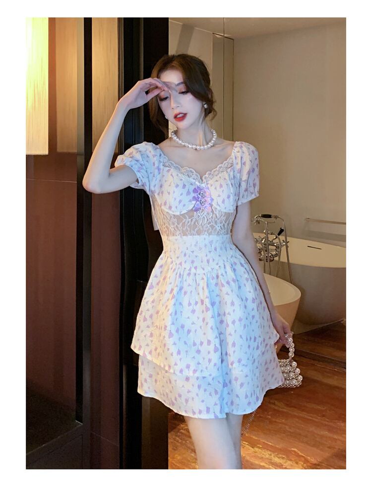 送料無料୨♥୧ サマーレディースミニドレス カラーフローラルリボンスリーブレースフリル ピンク レッド ラッフル 大人ガーリー スウィート キュート カジュアル 夏物 花柄 パープル スクウェア AOS16034786655