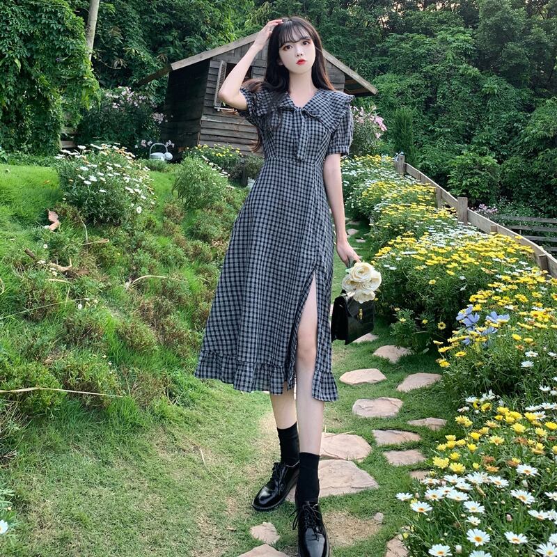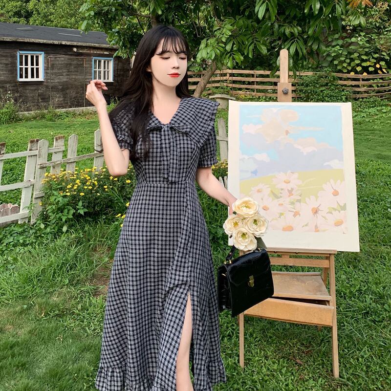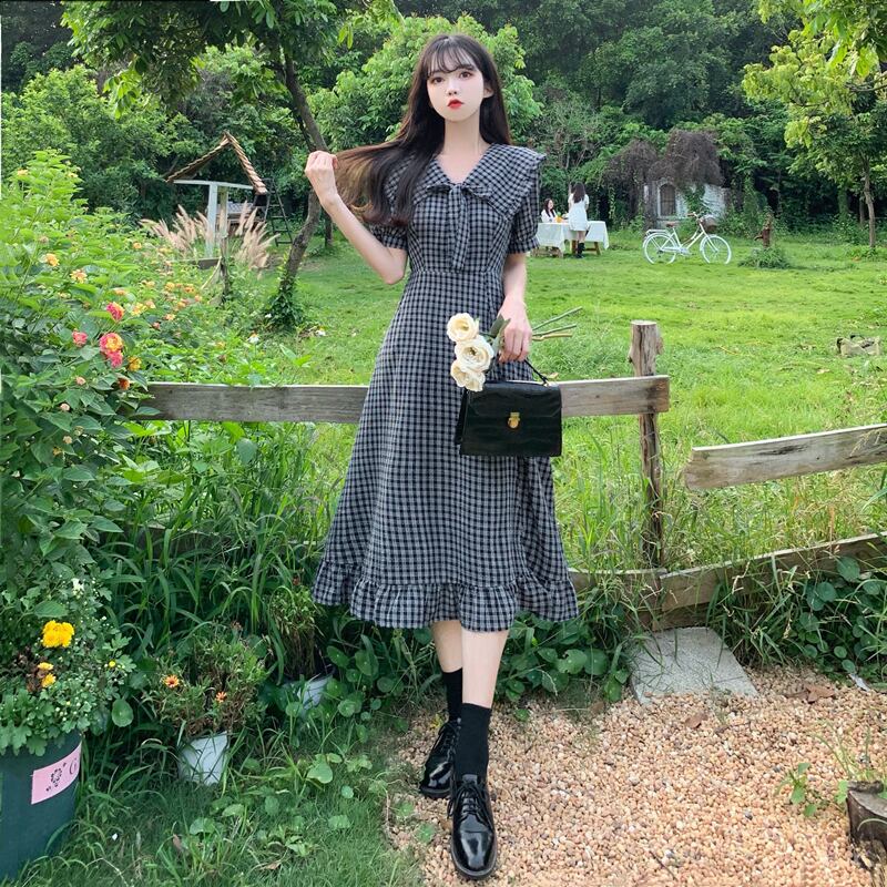 送料無料୨♥୧ サマーレディースミディAラインドレス カラーリボンブラック格子柄フリル ラッフル 大人ガーリー スウィート キュート カジュアル 夏物 AOS39359031309