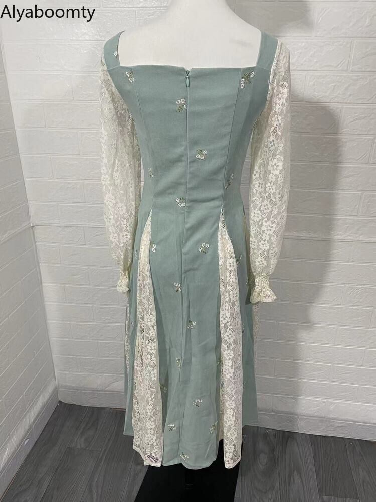 送料無料୨♥୧ スプリングレディーススタンダードドレス カラーレースパッチワークコーデュロイフローラルヴィンテージ刺繍ミディ レトロ 大人ガーリー スウィート キュート カジュアル 春物 花柄 スクウェア ビンテージ AOS92874549971