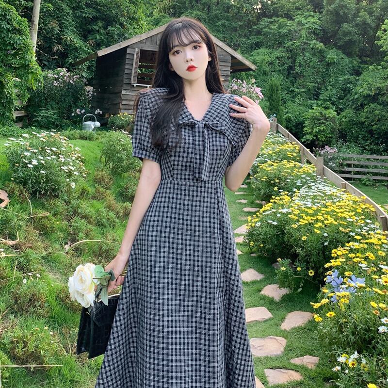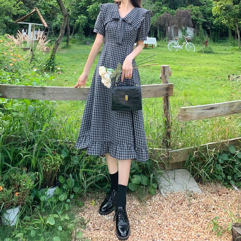 送料無料୨♥୧ サマーレディースミディAラインドレス カラーリボンブラック格子柄フリル ラッフル 大人ガーリー スウィート キュート カジュアル 夏物 AOS15463796691