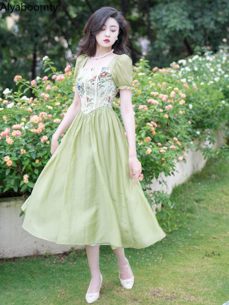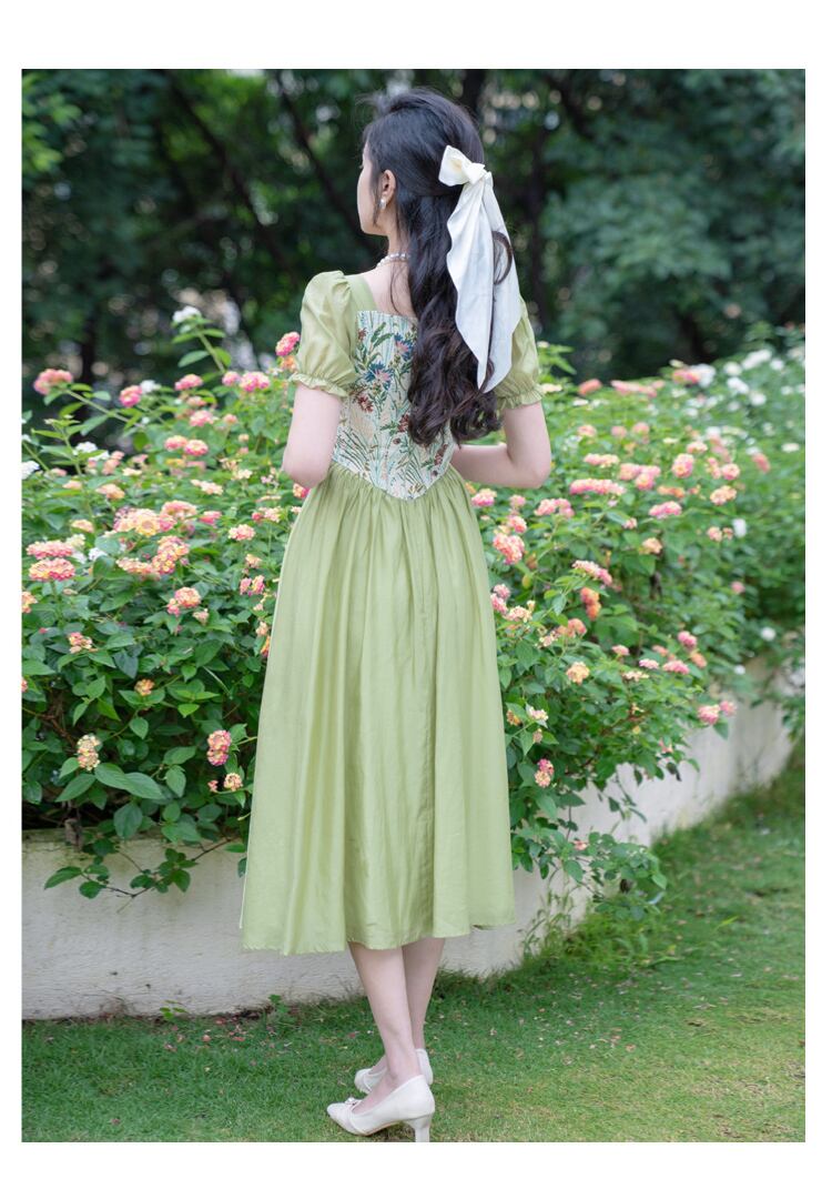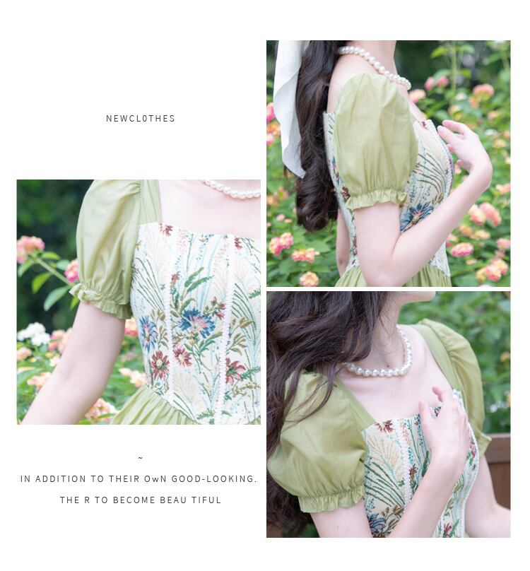 送料無料୨♥୧ サマーレディースグリーンミディヴィンテージドレス カラーパッチワークジャカードフローラルスリーブスタンダードAライン レトロ 夏物 花柄 スクウェア ビンテージ AOS16604574299