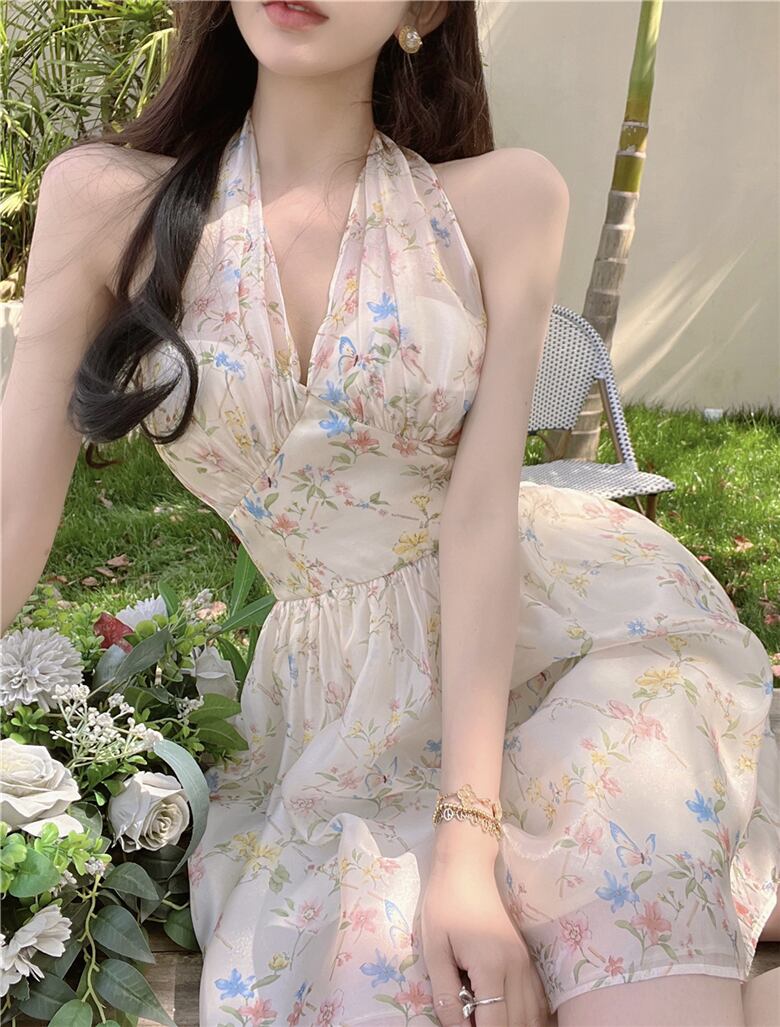 送料無料୨♥୧ サマーレディースミニドレス Vネックストラップレスフローラルプリントシフォンノースリーブドレス ワンピース 夏物 ビーチ 花柄 AOS84973439982