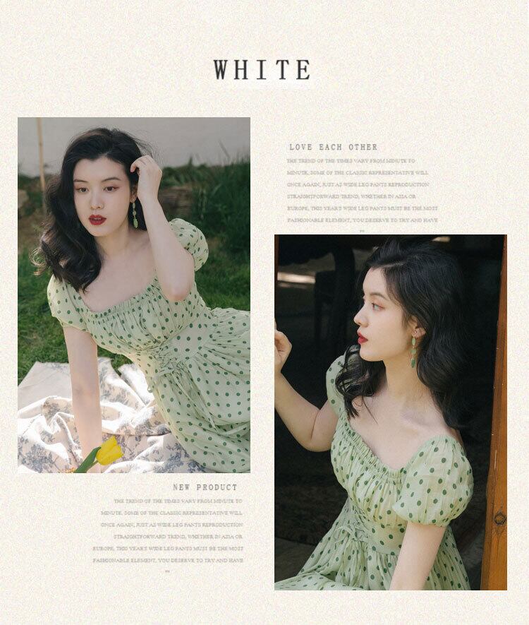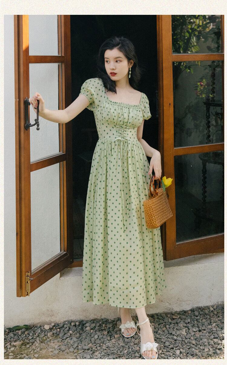 送料無料୨♥୧ サマーレディースロングAラインドレス カラー水玉バンドスリーブヴィンテージグリーンドレス ワンピース 夏物 スクウェア ビンテージ AOS66460809836
