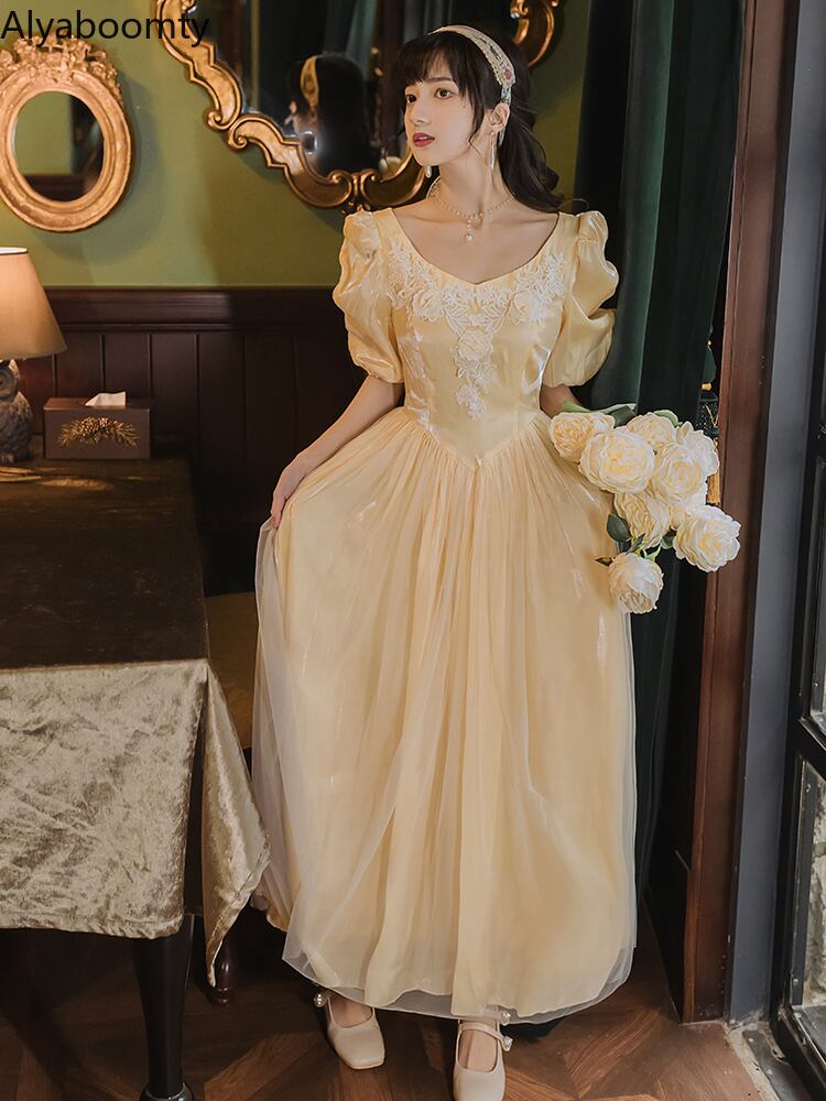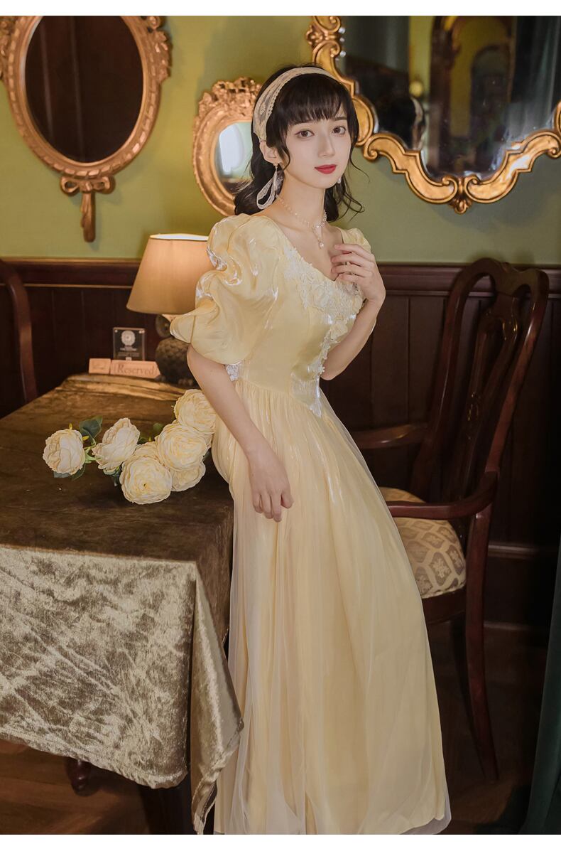 送料無料୨♥୧ サマーレディースミディドレス イエローレースパッチワークスリーブ 夏物 AOS16340305948