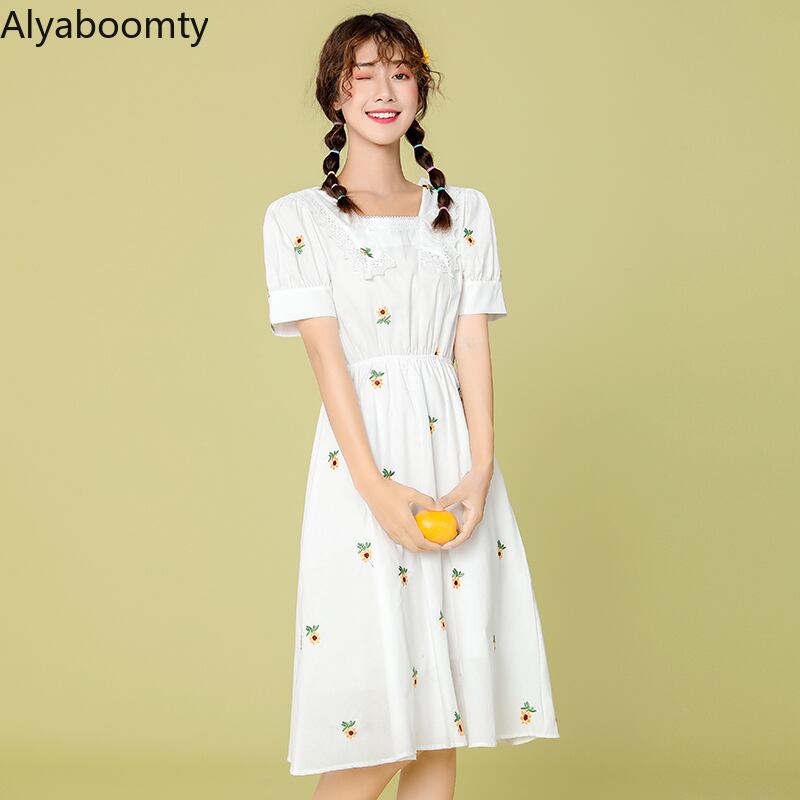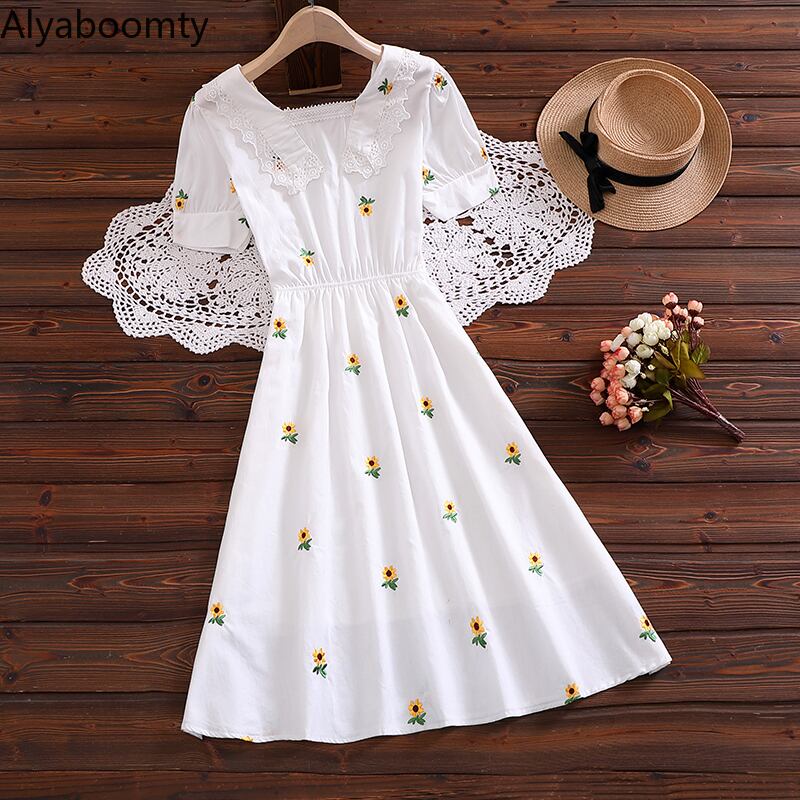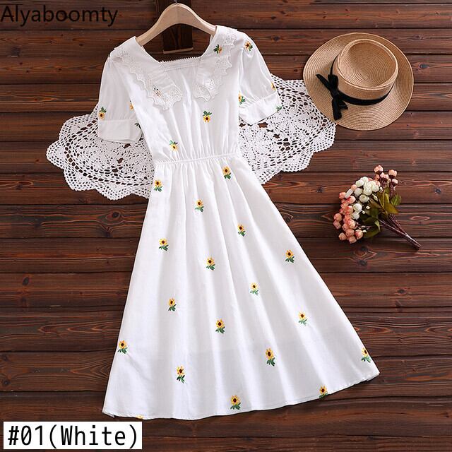 送料無料୨♥୧ サマーレディースAラインドレス スタイル刺繍レースフリルホワイト コットン ラッフル 大人ガーリー スウィート キュート カジュアル 夏物 フラワーデザイン AOS63586878214