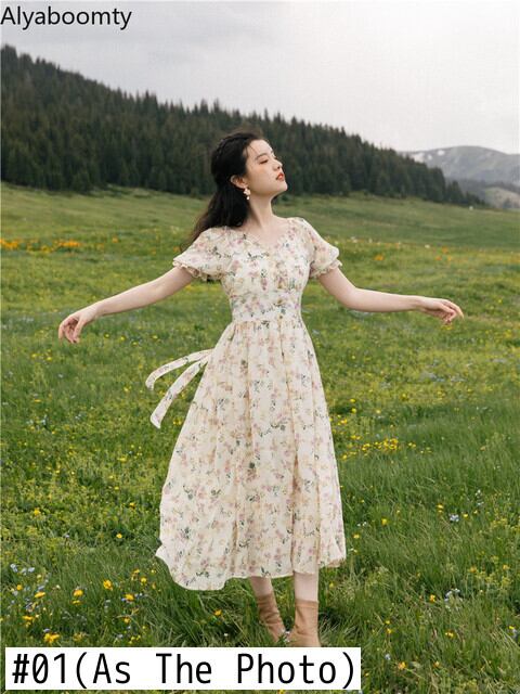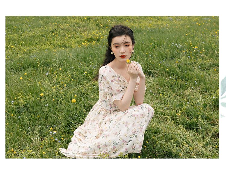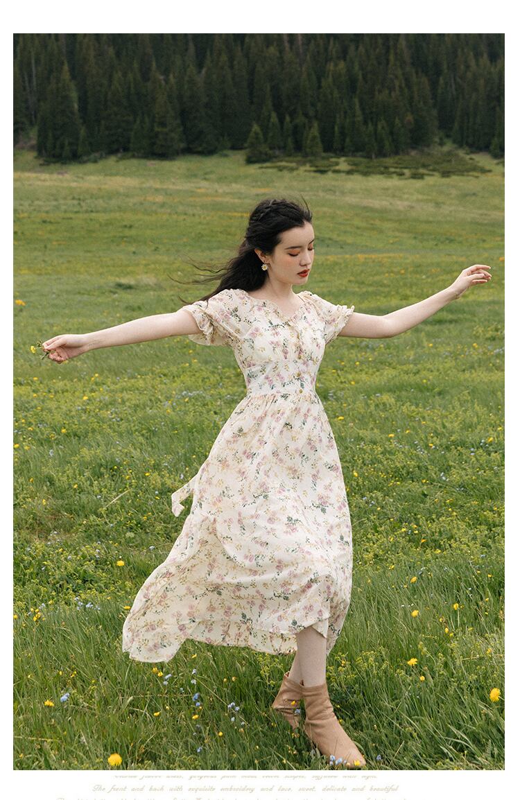 送料無料୨♥୧ サマーレディースミディヴィンテージドレス Vネックフローラル刺繍シフォンスリーブ 夏物 花柄 ビンテージ AOS21802875710