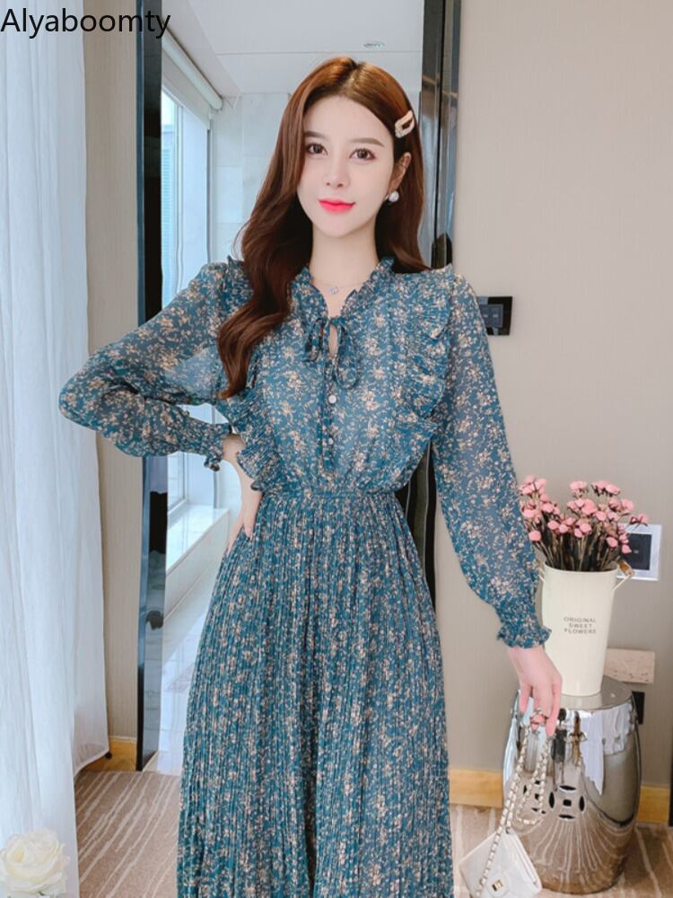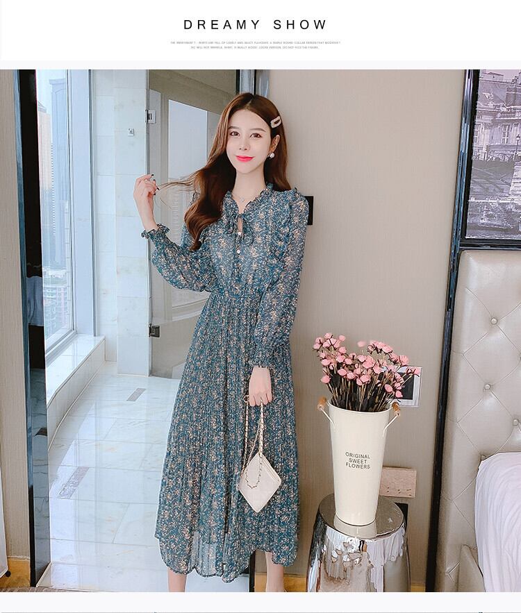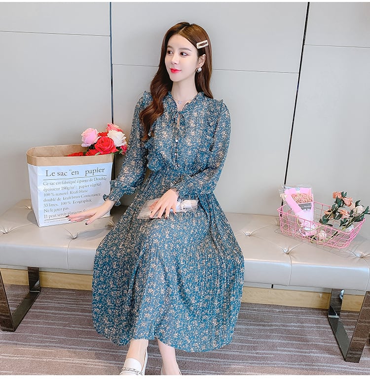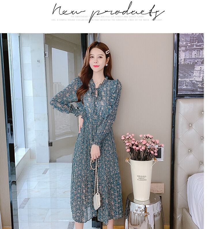 送料無料୨♥୧ スプリングオータムレディースロングドレス カラーフローラルプリント柄グリーンシフォンプリーツミディ 春物 秋物 花柄 AOS52664586943