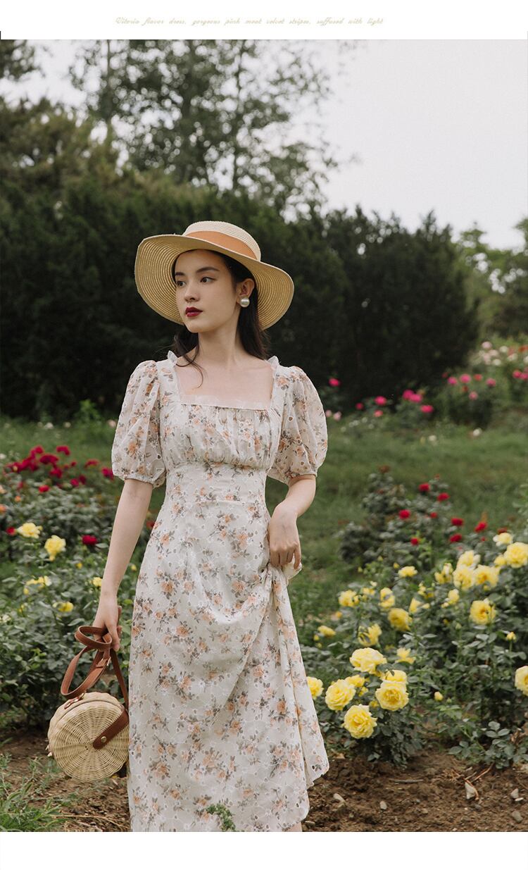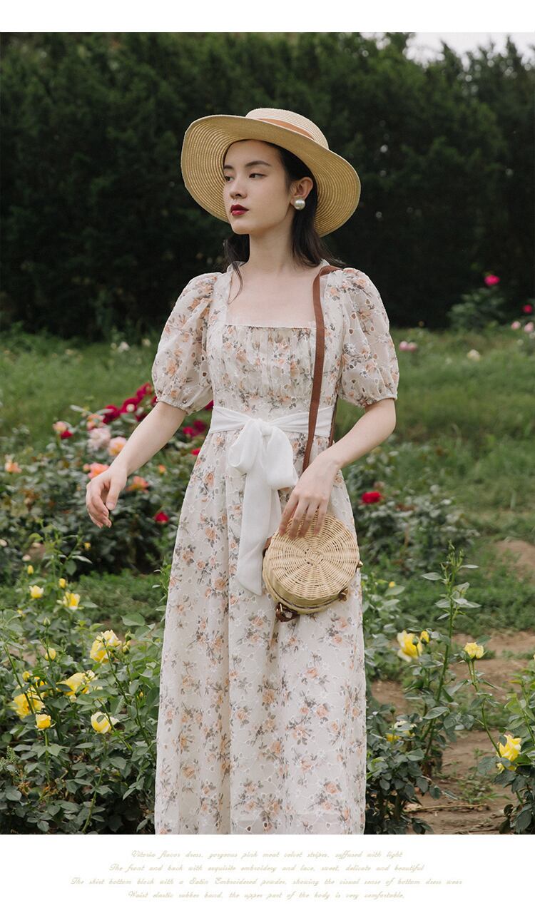 送料無料୨♥୧ サマーレディーススタンダードドレス カラーフローラルシフォンミディスリーブ刺繍 レトロ 大人ガーリー スウィート キュート カジュアル 夏物 花柄 スクウェア AOS77418019354