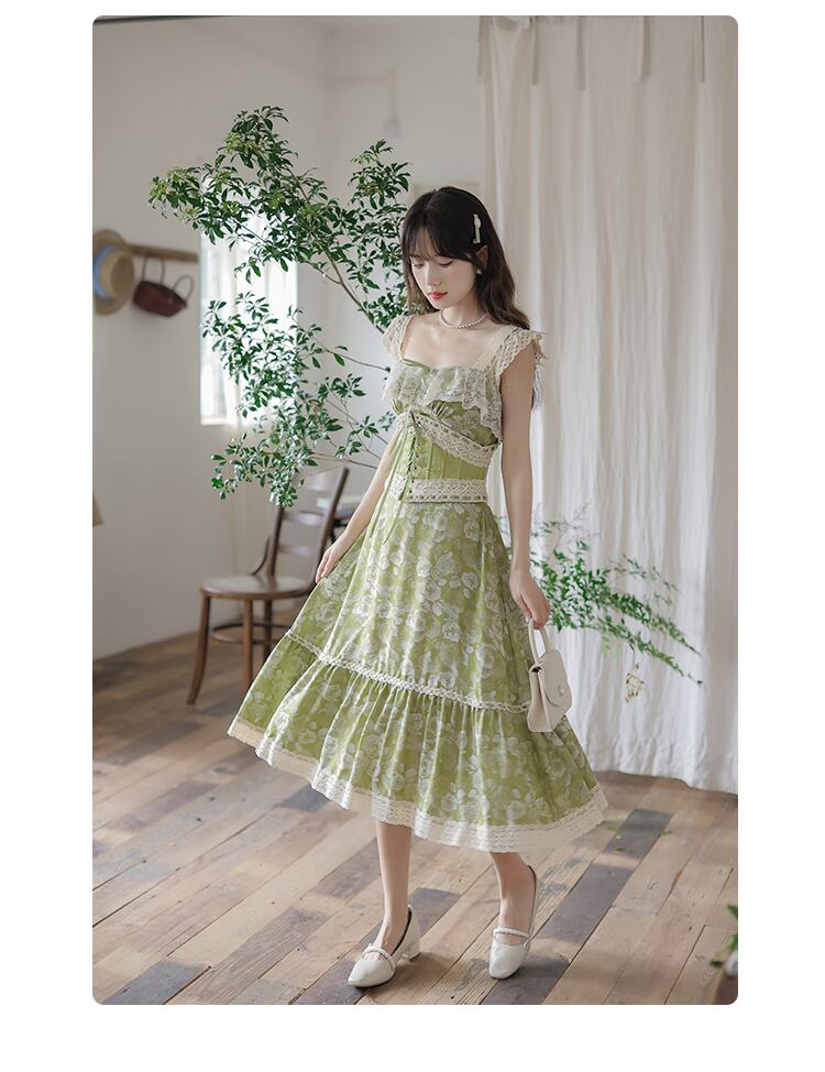 送料無料୨♥୧ サマーレディースミディドレス グリーンフローラルプリントレースノースリーブヴィンテージフリルドレス ワンピース ラッフル 大人ガーリー スウィート キュート カジュアル 夏物 花柄 ビンテージ AOS79562029428
