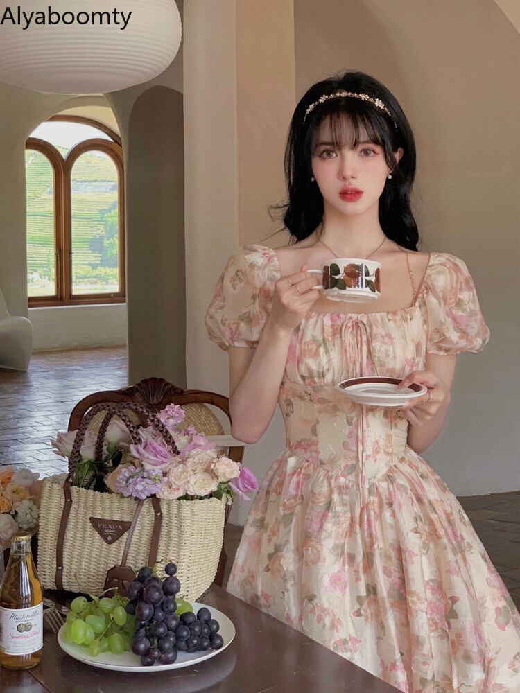 送料無料୨♥୧ サマーレディースドレス カラーフローラルヴィンテージ プリント 大人ガーリー スウィート キュート カジュアル 夏物 花柄 ソリッドカラー スクウェア ビンテージ AOS16606118264