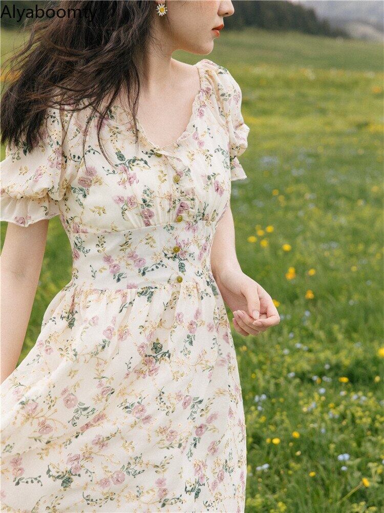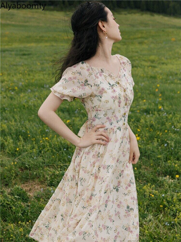 送料無料୨♥୧ サマーレディースミディヴィンテージドレス Vネックフローラル刺繍シフォンスリーブ 夏物 花柄 ビンテージ AOS41690039031