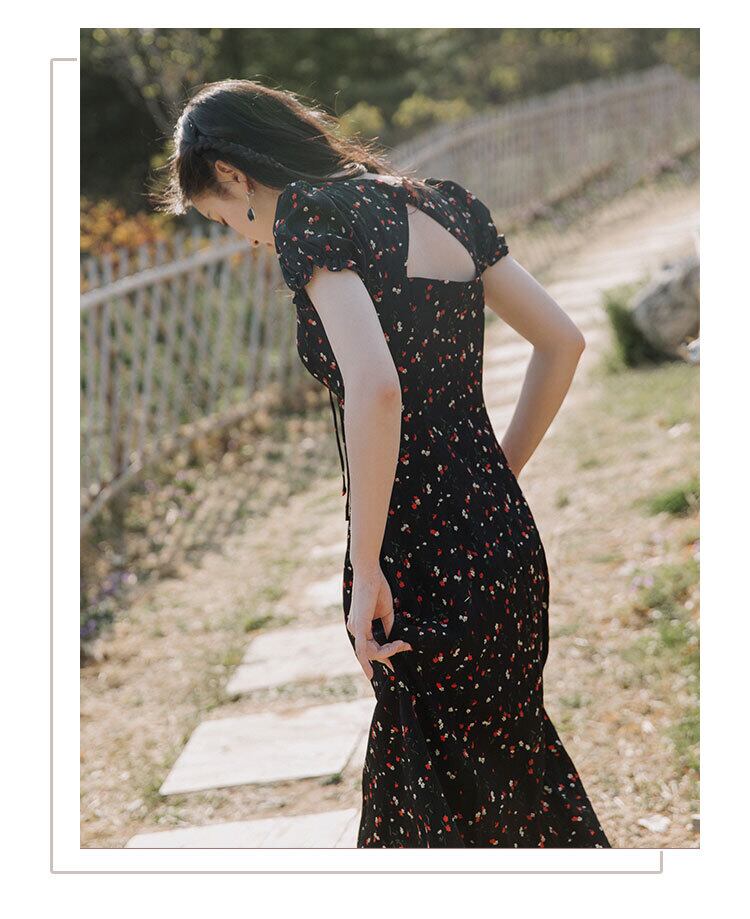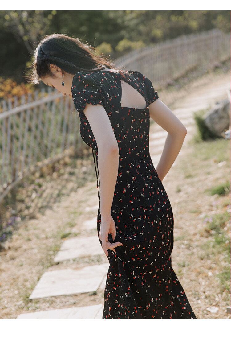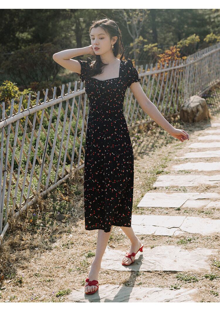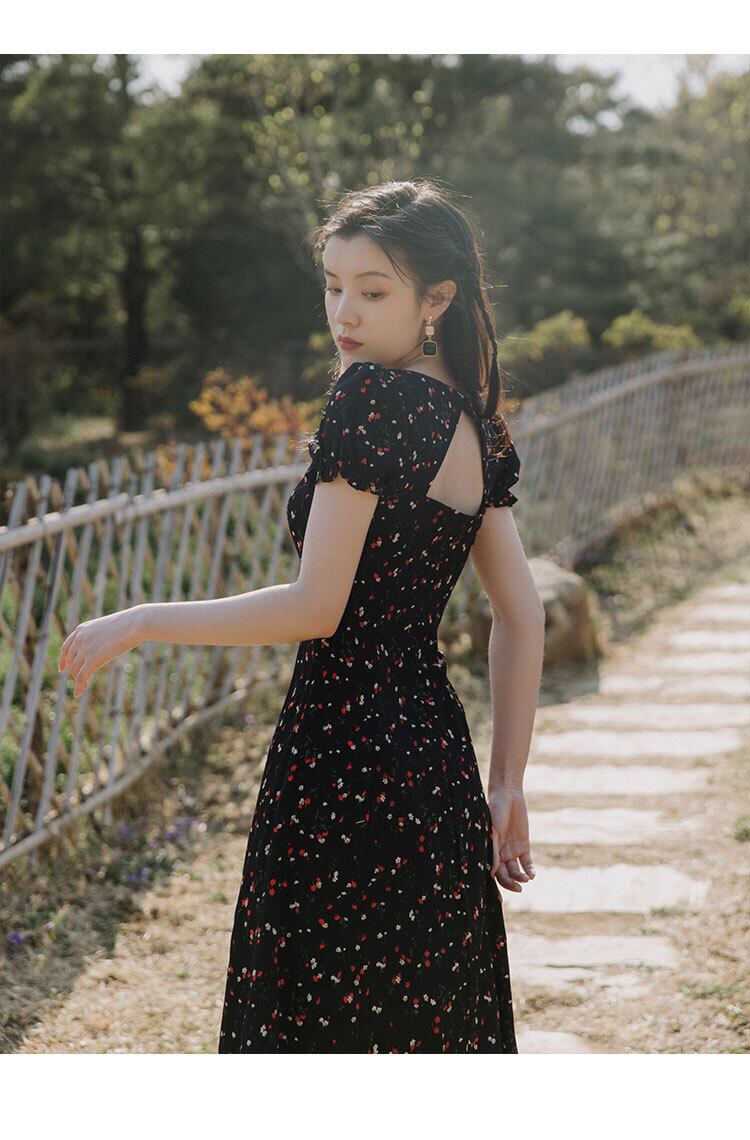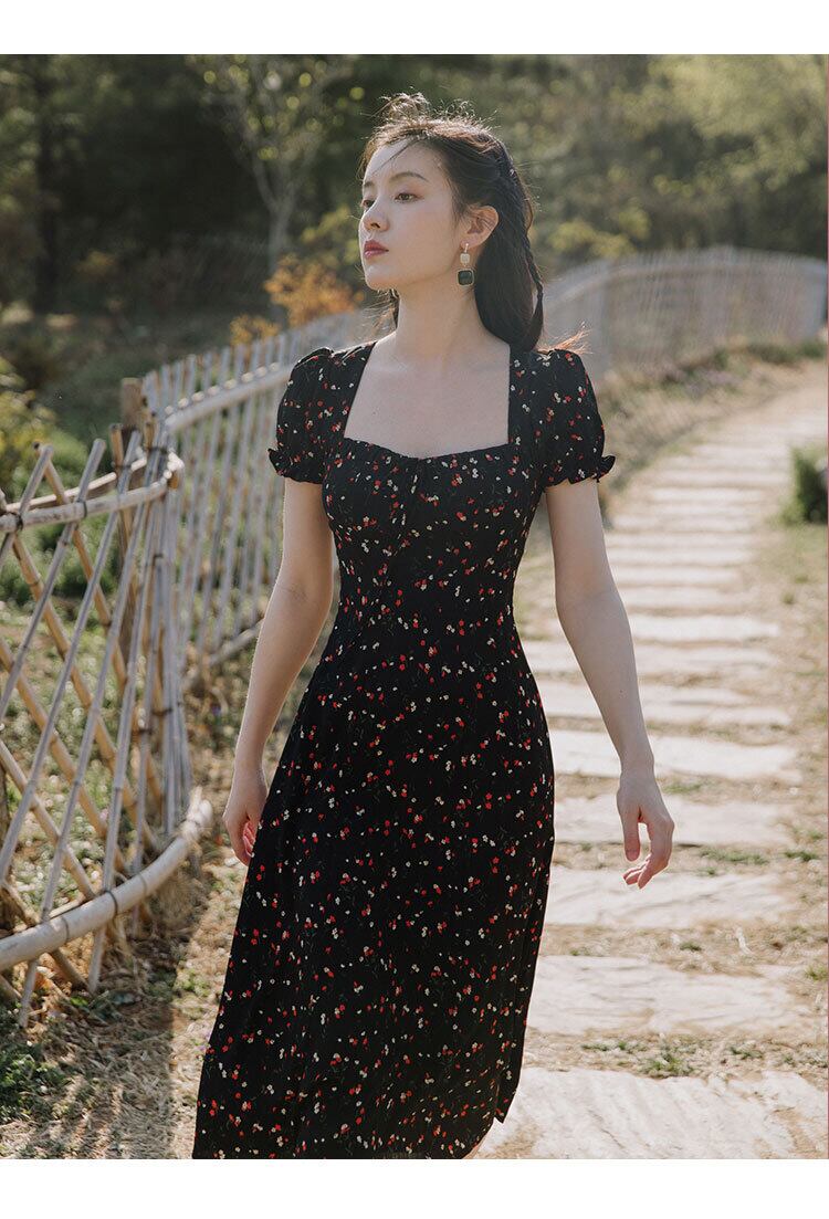 送料無料୨♥୧ サマーレディースAラインミディブラックドレス カラーフローラルプリントヴィンテージスリムスリーブ 夏物 花柄 スクウェア ビンテージ AOS34024501164