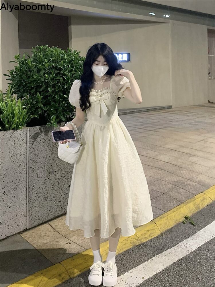 送料無料୨♥୧ サマーレディースミディドレス カラーリボンスリーブ 大人ガーリー スウィート キュート カジュアル 夏物 スクウェア AOS15927363812