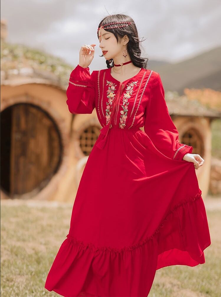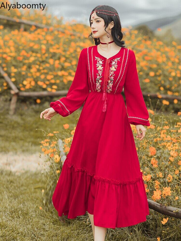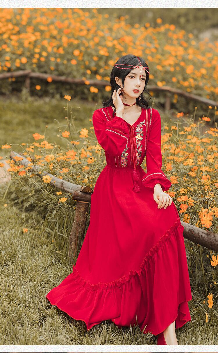 送料無料୨♥୧ スプリングレディースボヘミアンレッドミディドレス Vネックフローラル刺繍エスニックスタイルフリルヴィンテージ ラッフル 春物 花柄 ビンテージ AOS46896977480