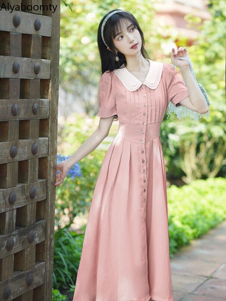 送料無料୨♥୧ スタイルサマーレディースミディドレス カラーブルーシャツ スリーブ ピンク 大人ガーリー スウィート キュート カジュアル 夏物 AOS85898640021