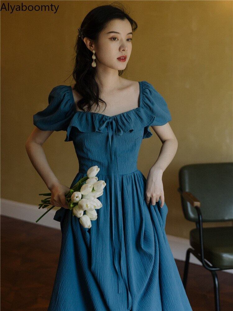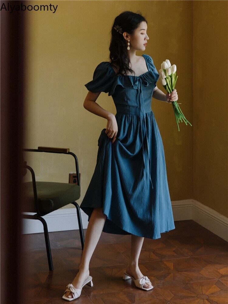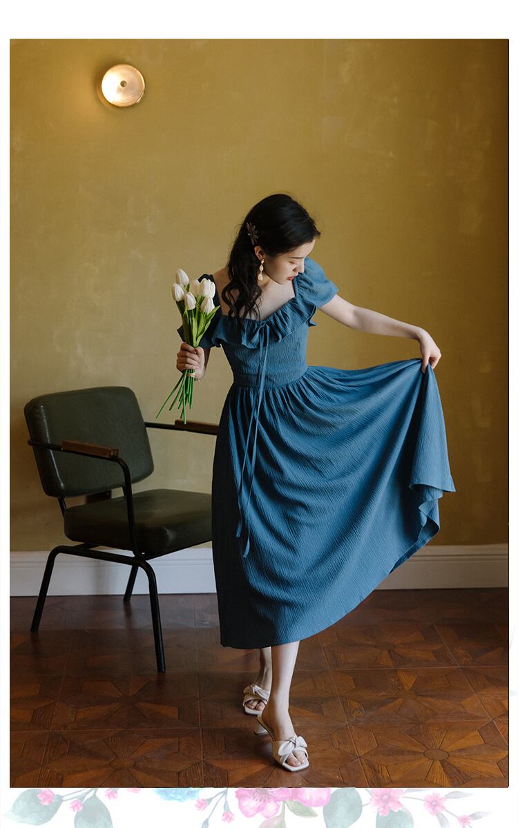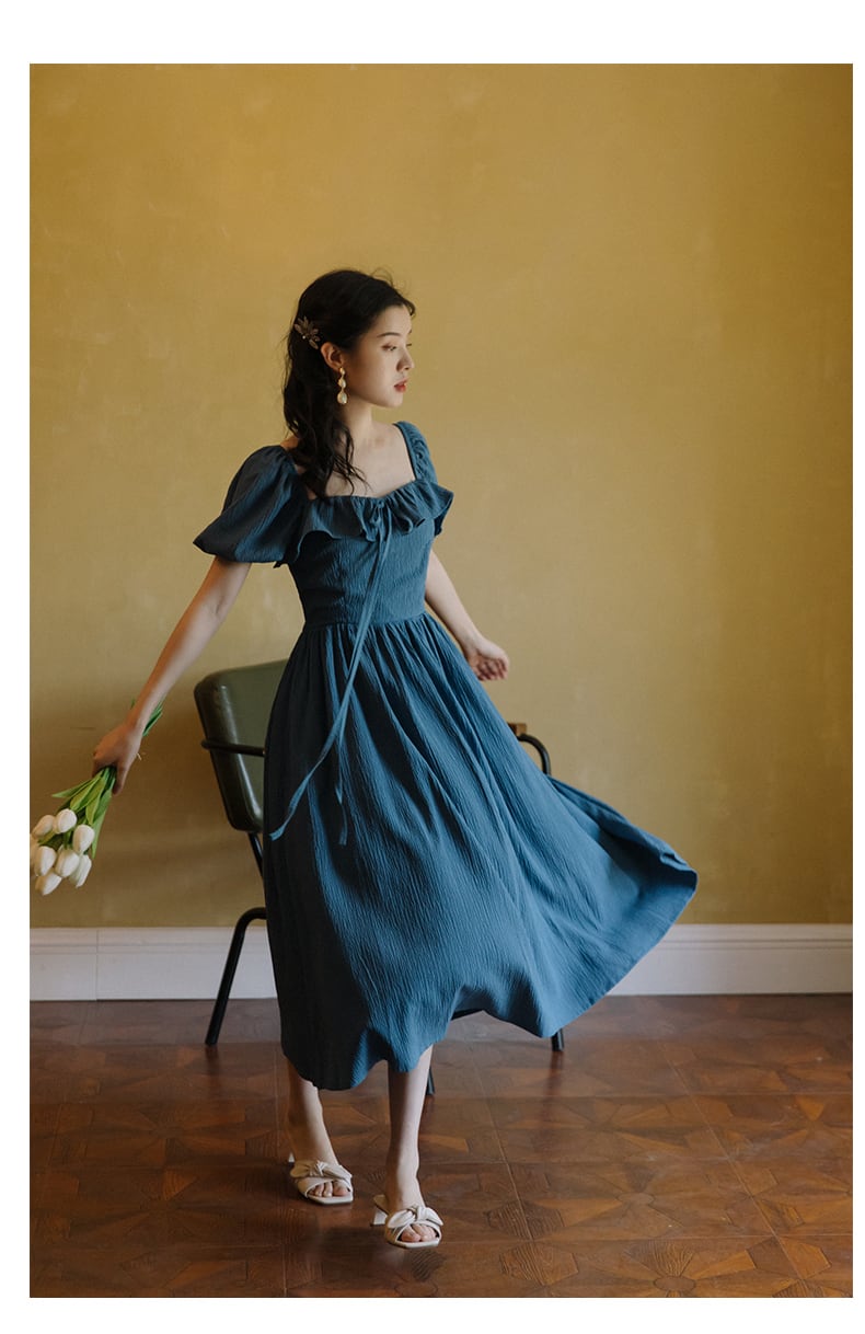 送料無料୨♥୧ サマーレディーススタイルロングドレス カラーフリルブルースリーブヴィンテージドレス ワンピース ラッフル 夏物 スクウェア ビンテージ AOS71977500456