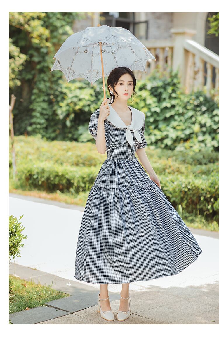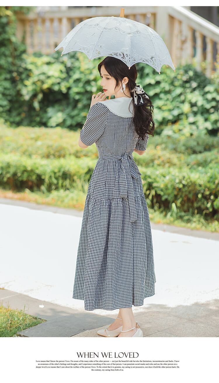 送料無料୨♥୧ サマーレディースミディドレス カラー格子柄スタイルスリーブリボンフリル ホワイト ブラック ラッフル 大人ガーリー スウィート キュート カジュアル 夏物 AOS20983547526