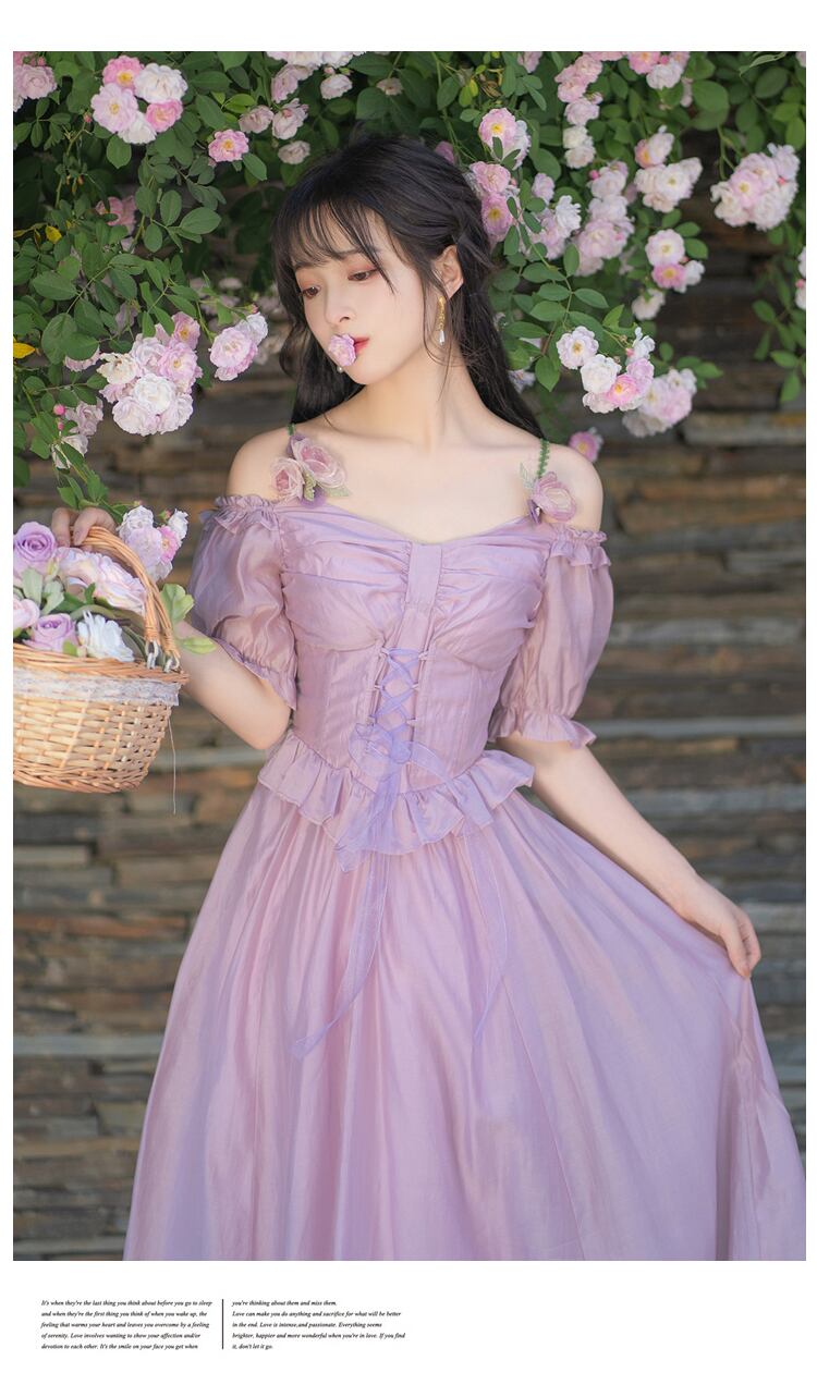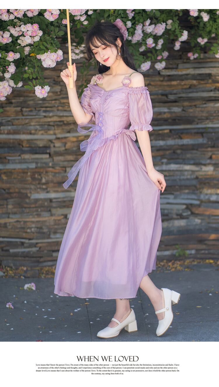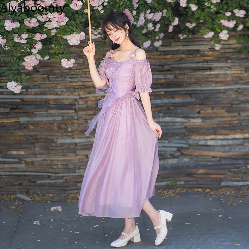 送料無料୨♥୧ サマーレディースミディドレス オフショルダーフローラルストラップ 大人ガーリー スウィート キュート カジュアル 夏物 花柄 パープル AOS69517585773
