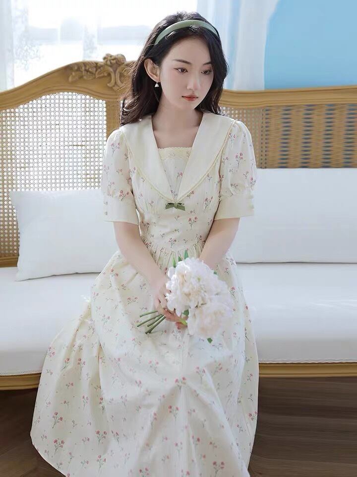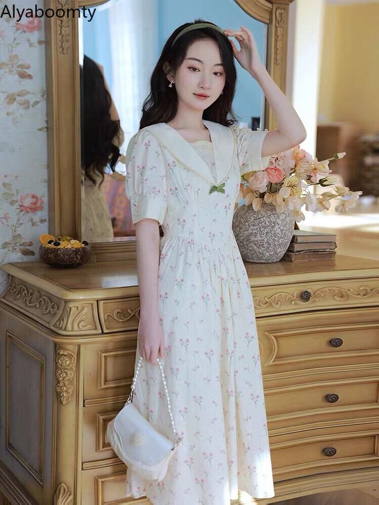 送料無料୨♥୧ サマーレディースミディドレス カラーリボンフローラルプリントスリーブ 大人ガーリー スウィート キュート カジュアル 夏物 花柄 AOS86413324392