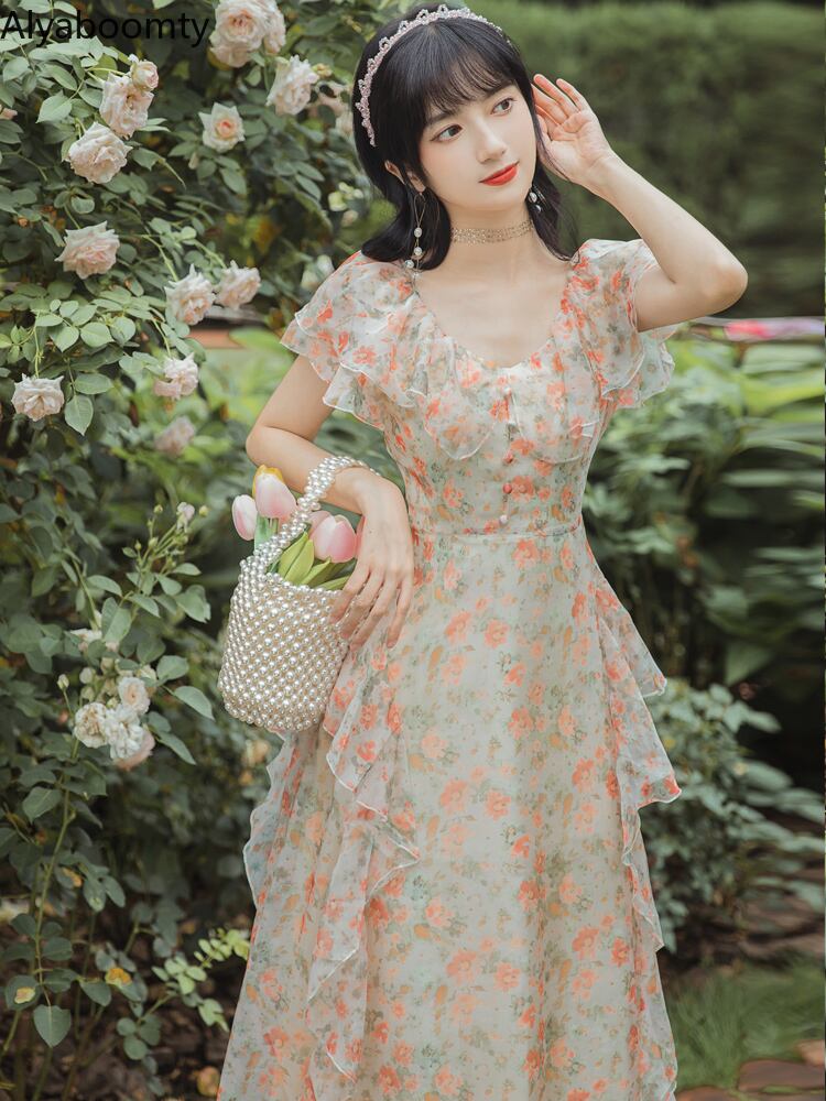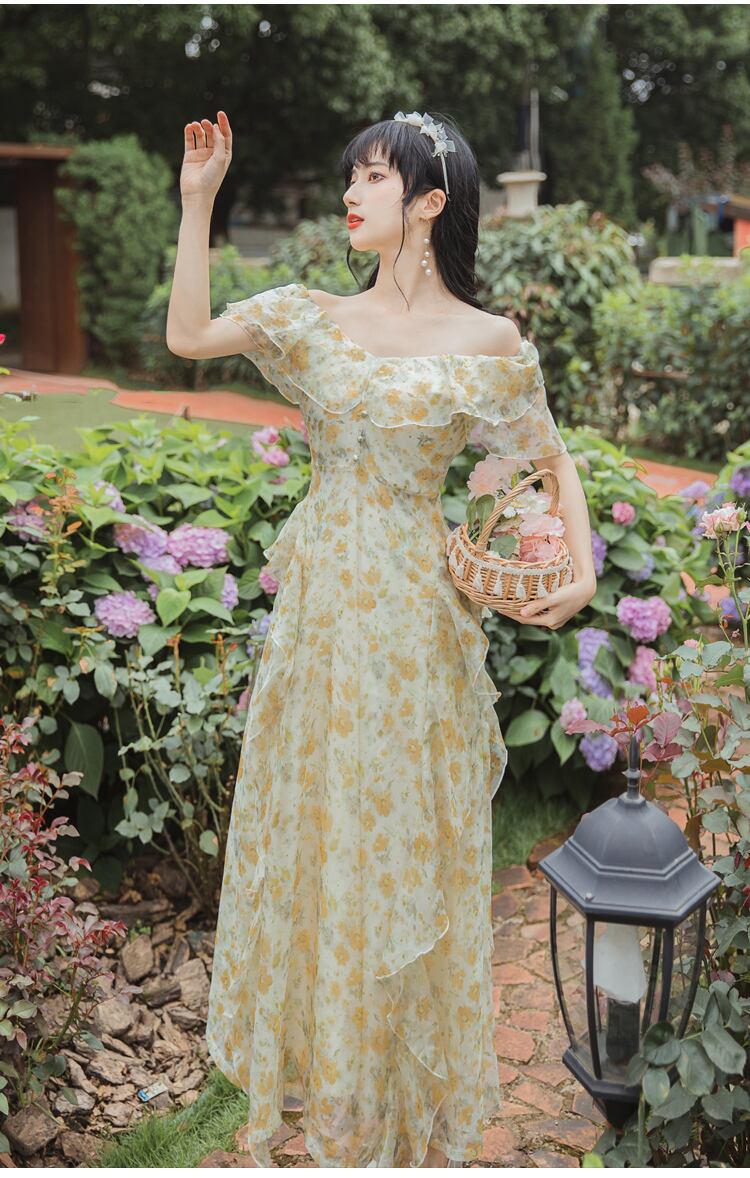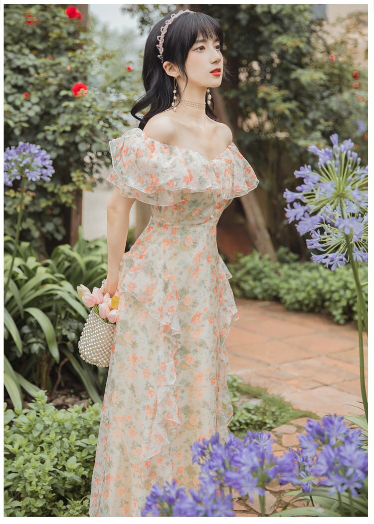 送料無料୨♥୧ サマーレディースマキシロングドレス イエローオレンジフローラルプリントフリルシフォン レッド ラッフル 夏物 花柄 AOS70463142504