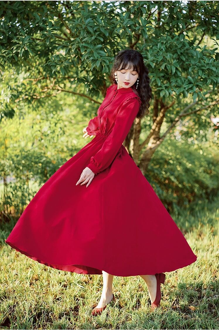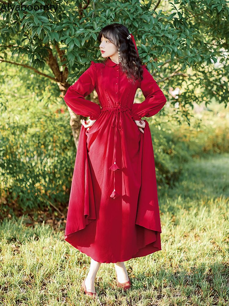 送料無料୨♥୧ スプリングオータムレディースロングドレス カラーレッドレーススリーブヴィンテージ 大人ガーリー スウィート キュート カジュアル 春物 秋物 レースアップ ビンテージ AOS95983916328