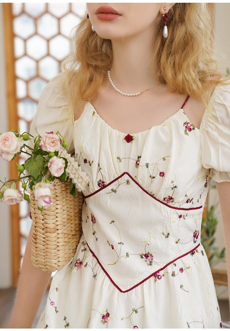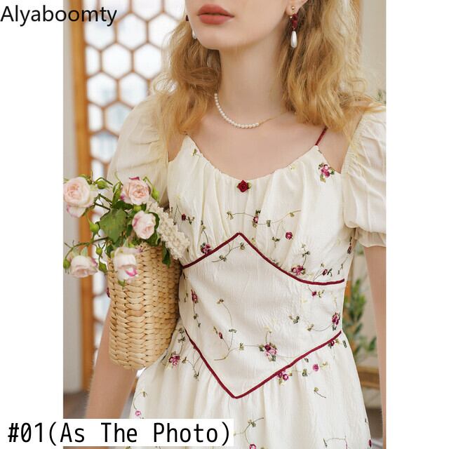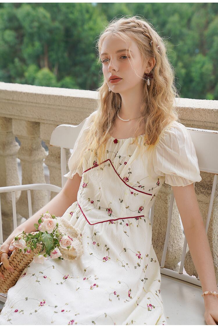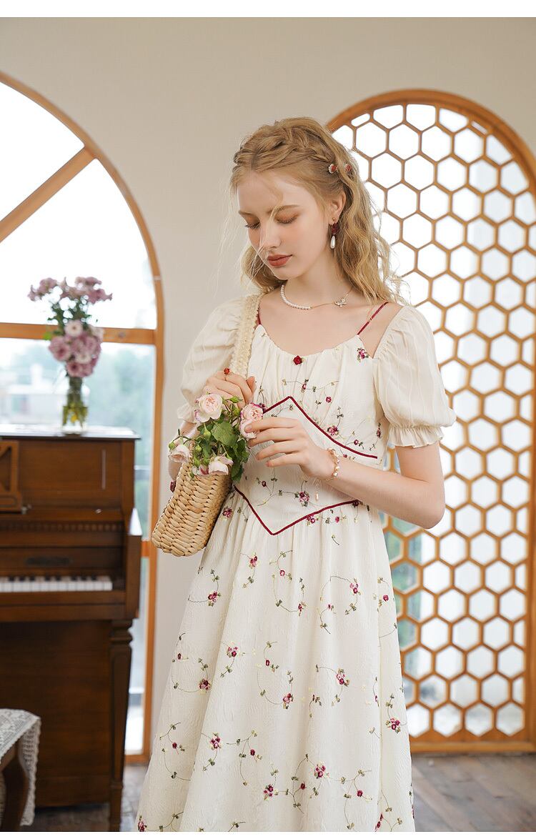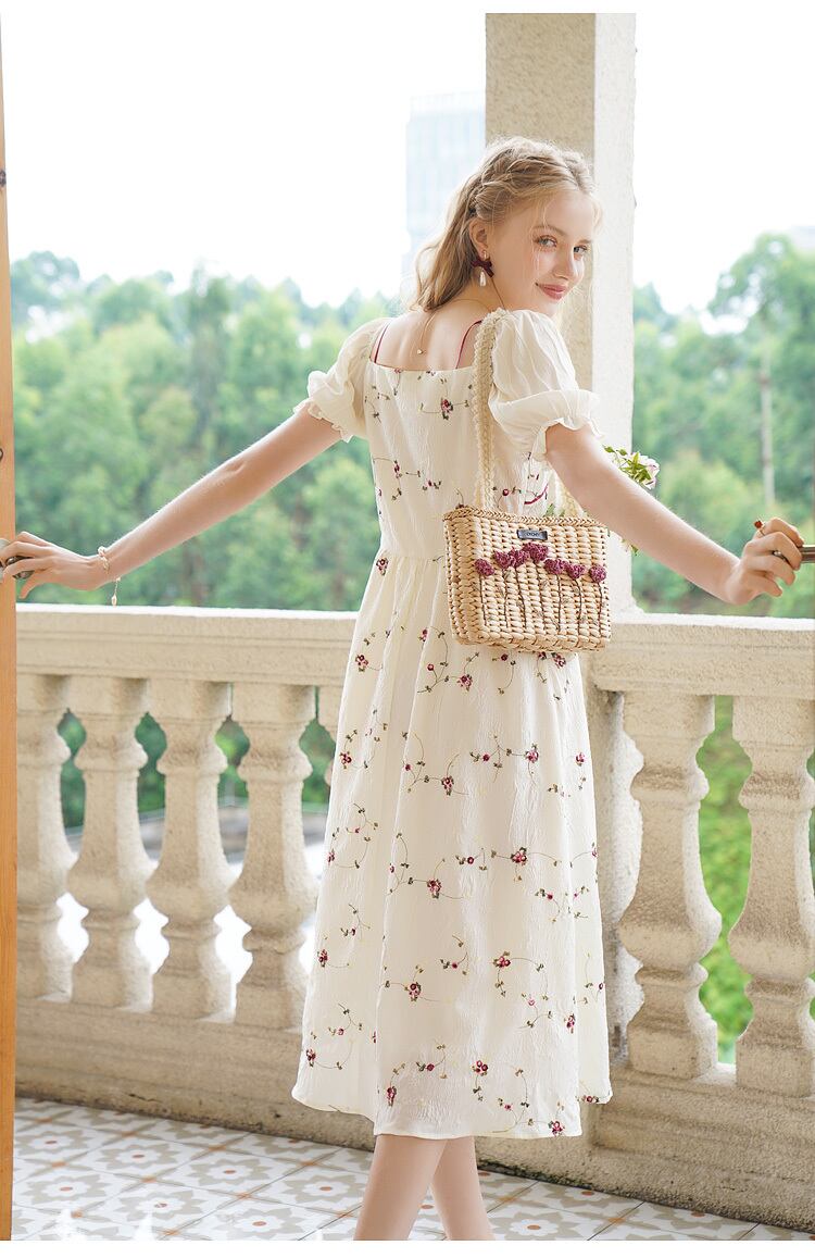 送料無料୨♥୧ サマーレディースロングドレス カラーストラップ フローラルジャカードスリーブ刺繍 夏物 花柄 スクウェア AOS37428837740