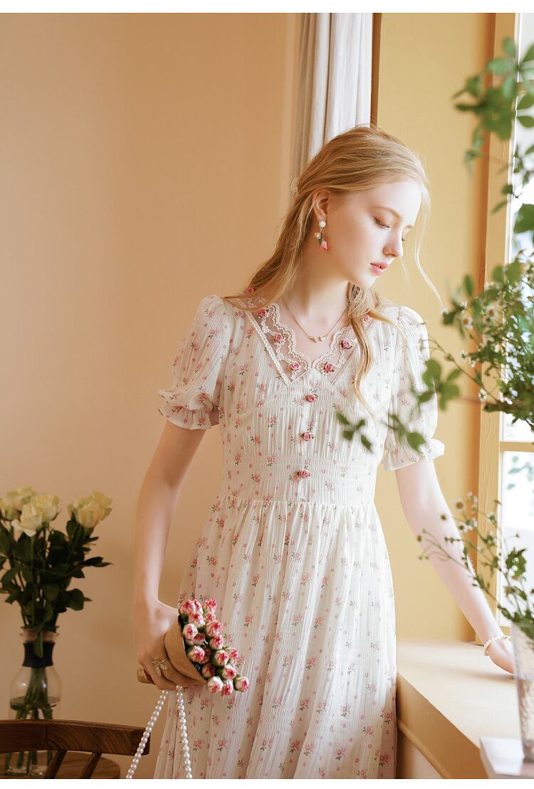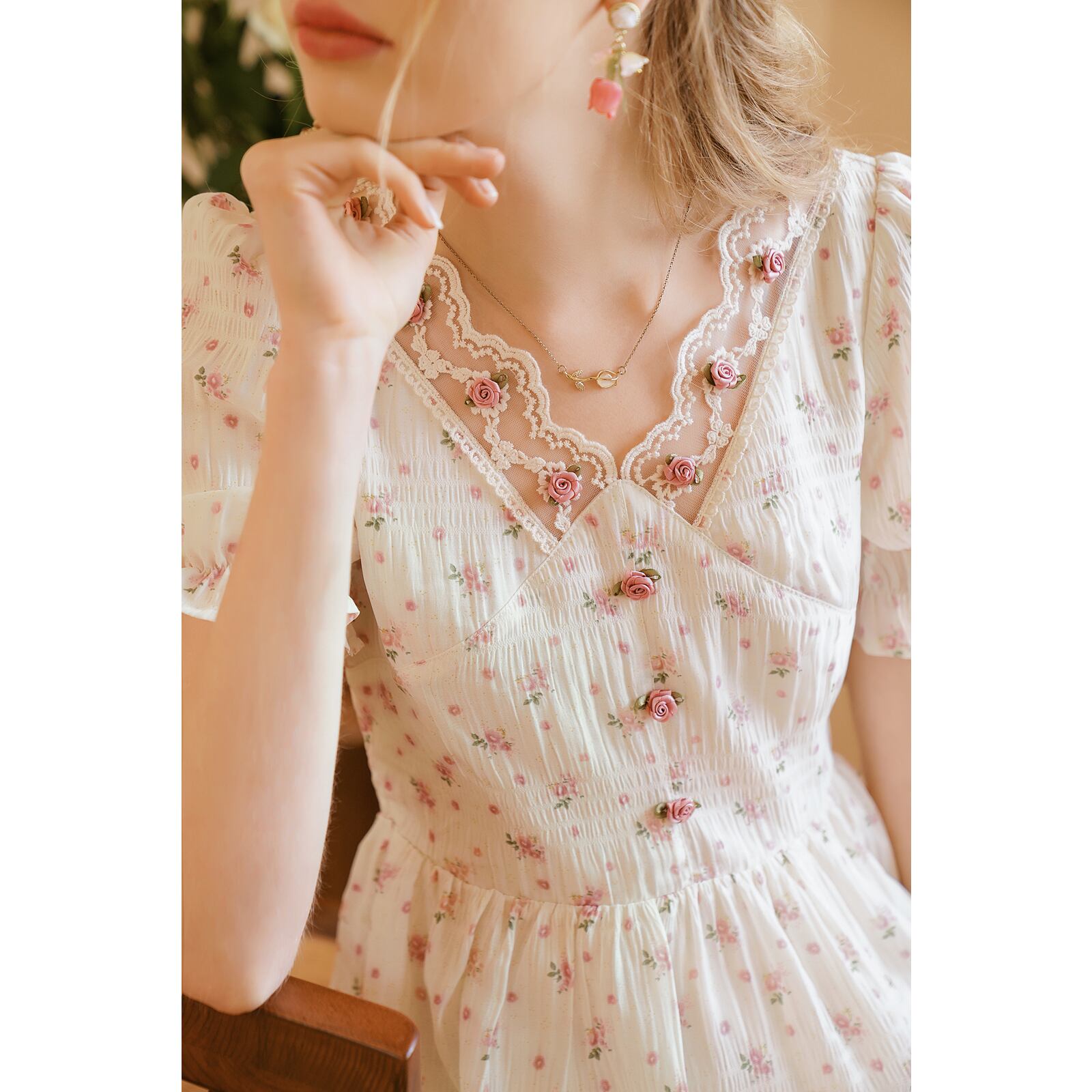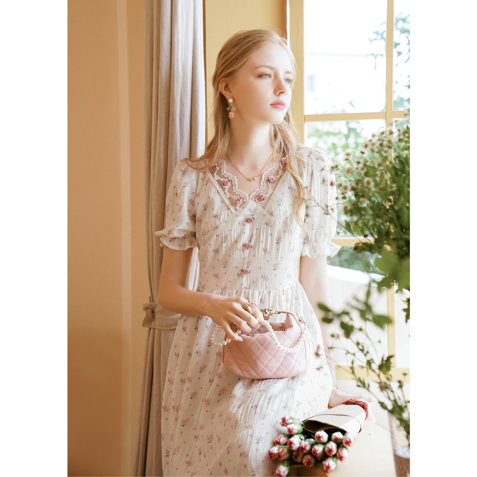 送料無料୨♥୧ サマーレディースミディラインドレス Vネックレーススリーブフローラル ピンク 大人ガーリー スウィート キュート カジュアル 夏物 花柄 Aライン AOS52850347522