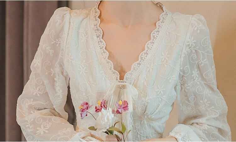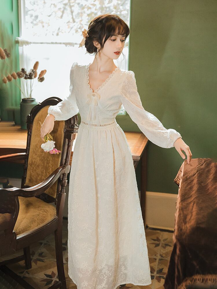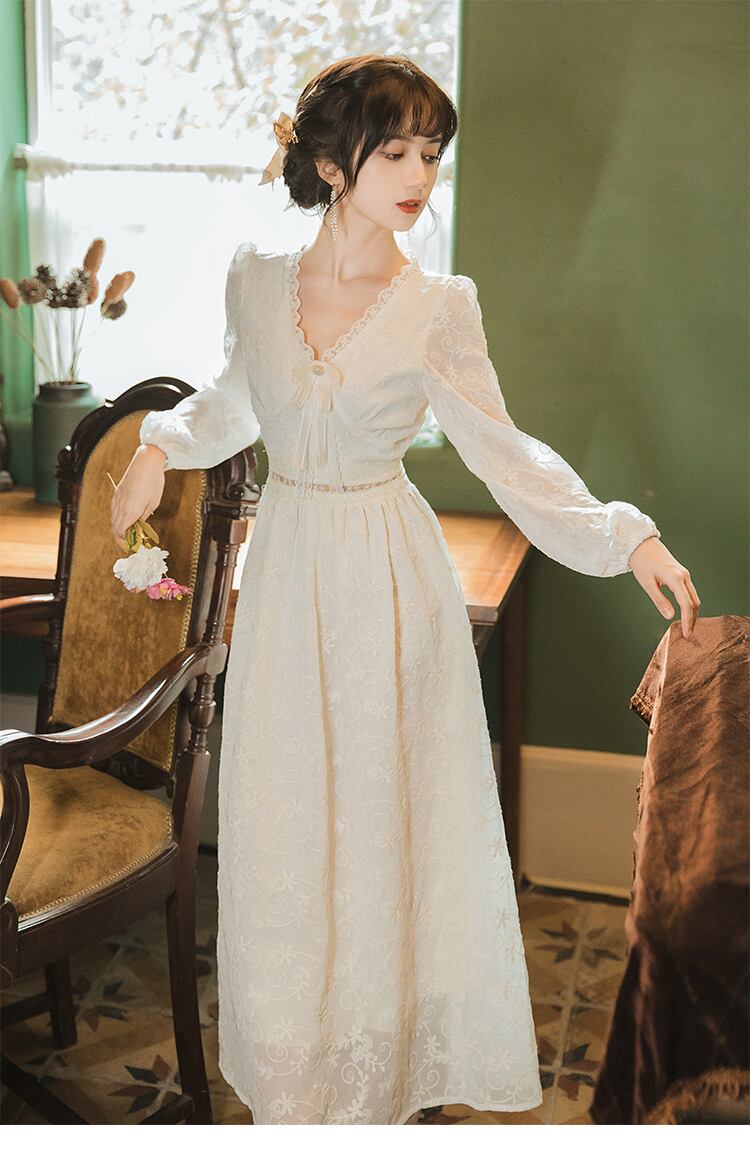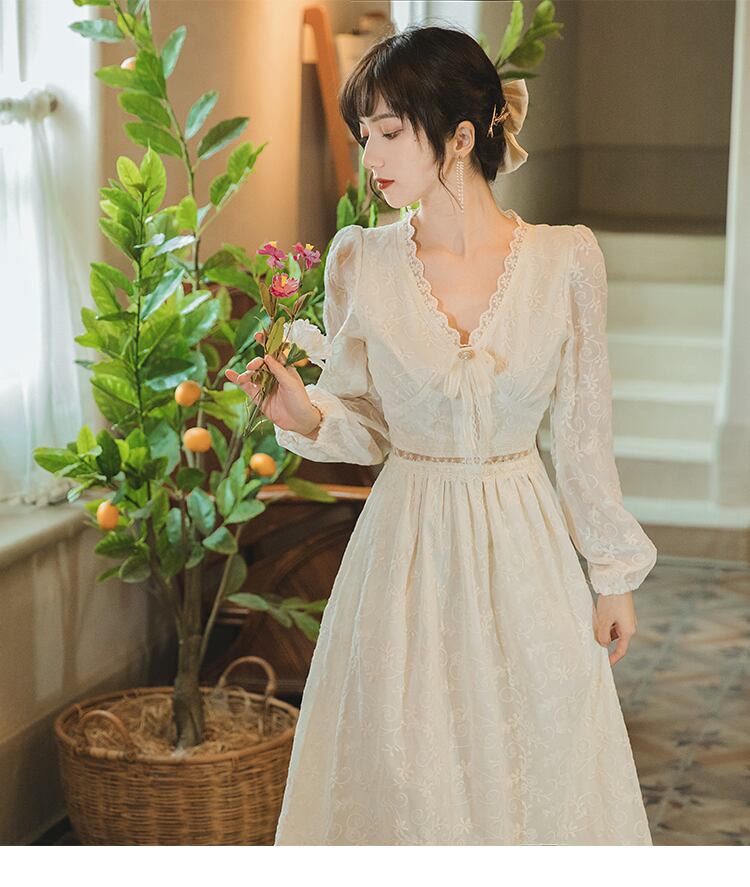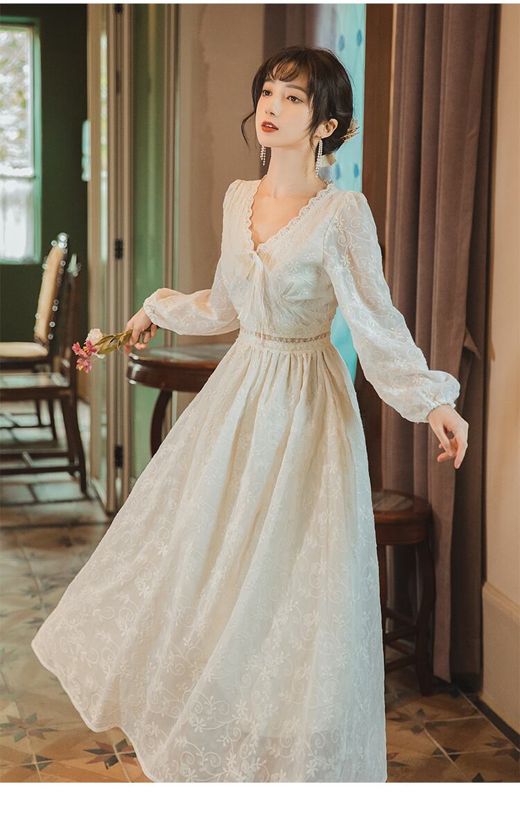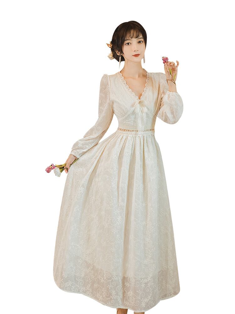 送料無料୨♥୧ スプリングオータムレディースミディドレス Vネックリボンフローラル刺繍長袖スリーブ ロング 春物 秋物 花柄 AOS42024275517